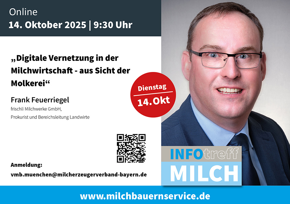 14.10.2025 | 09:30 Uhr bis 11:00 Uhr | "Digitale Vernetzung in der Milchwirtschaft - aus Sicht der Molkerei" | Gastreferent: Frank Feuerriegel / frischli Milchwerke | online * |