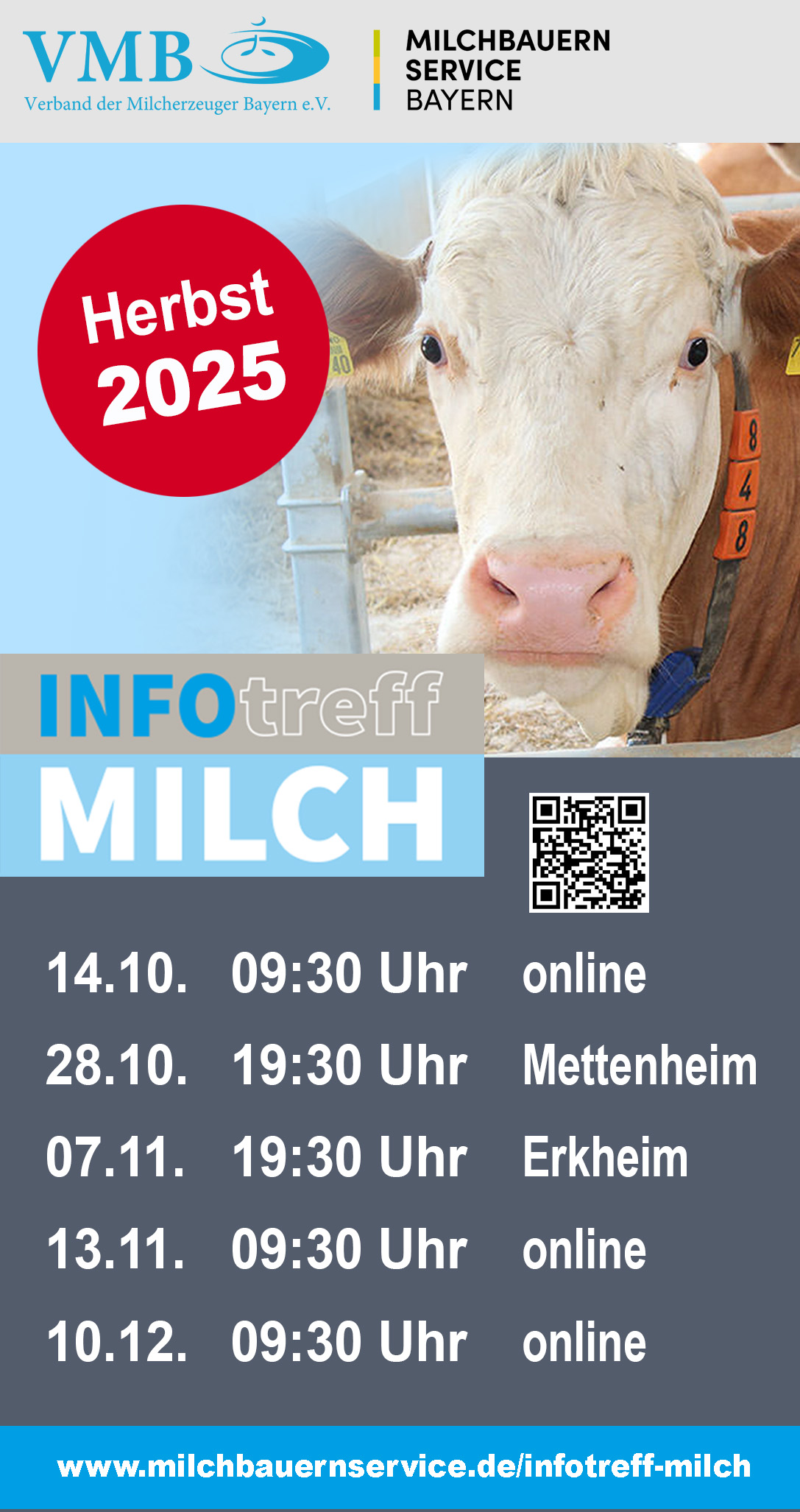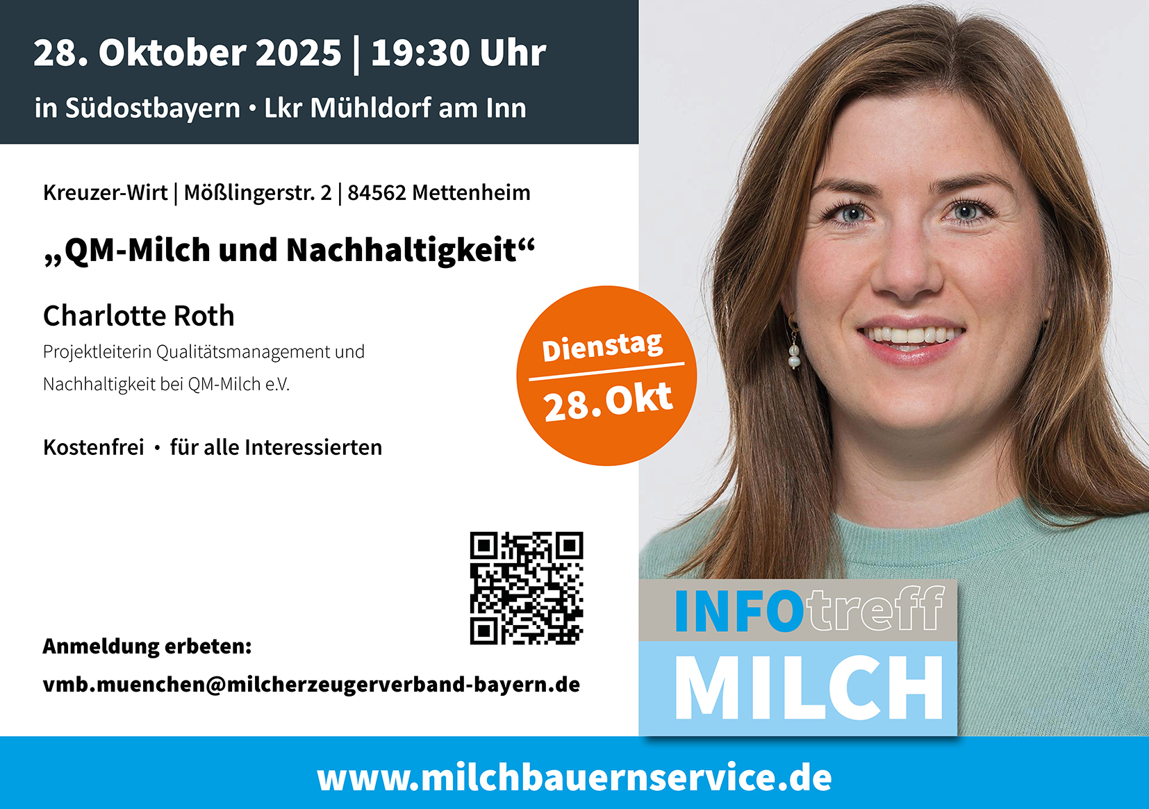 28.10.2025 | 19:30 Uhr bis 22.30 Uhr | "QM-Milch und Nachhaltigkeit" | Gastreferentin: Charlotte Roth / QM-Milch e.V. | Gasthof Kreuzer Wirt, 84562 Mettenheim |