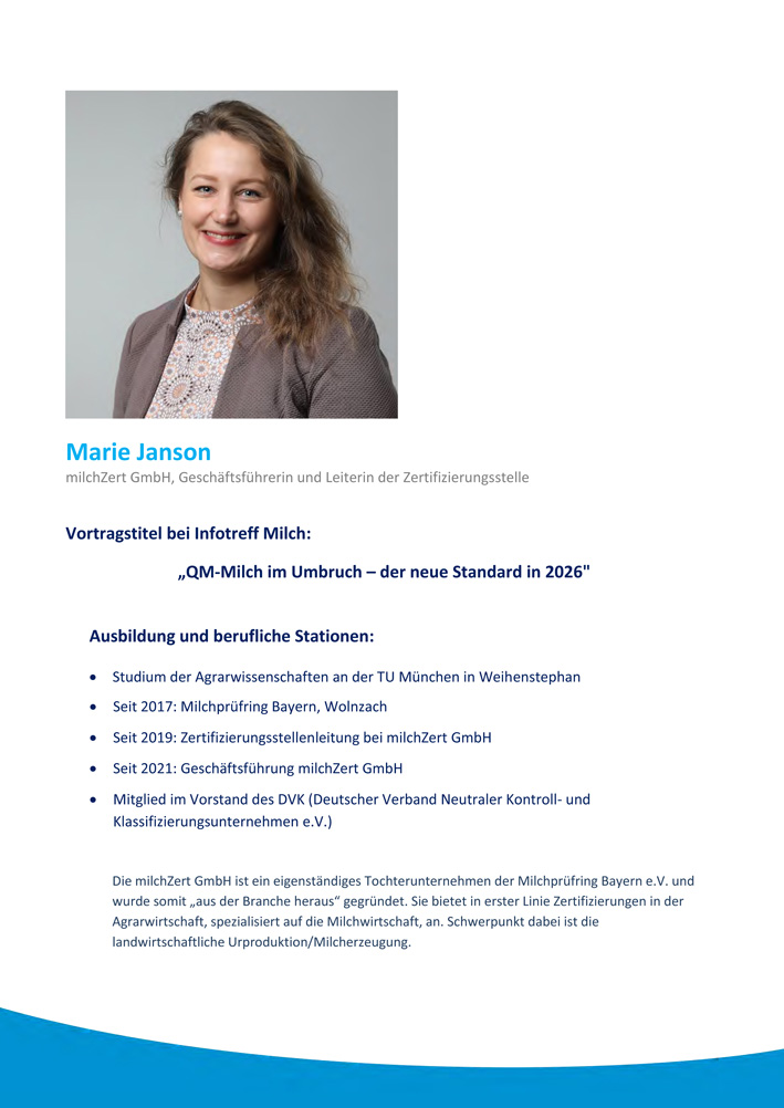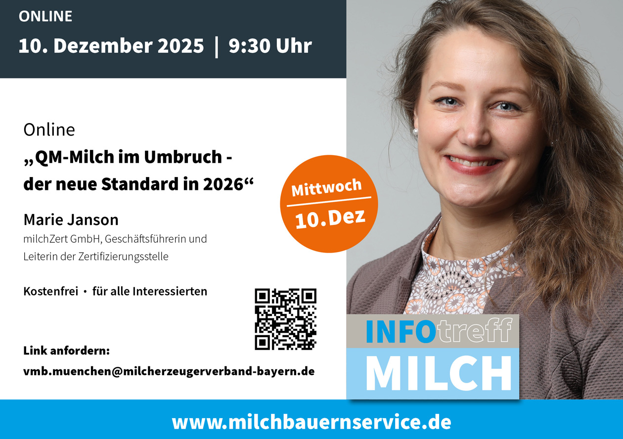 | 10.12.2025 | 09:30 bis 11:00 Uhr | "QM-Milch im Umbruch - der neue Standard in 2026" | Gastreferentin: Marie Janson / milchZert GmbH, Geschäftsführerin und Leiterin der Zertifizierungsstelle | online * |