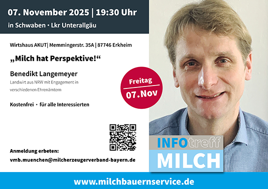 07.11.2025 | 19:30 Uhr bis 22.30 Uhr | “Milch hat Perspektive!” | Gastreferent: Benedikt Langemeyer / Landwirt aus NRW mit Engagement in verschiedenen Ehrenämtern | Wirtshaus AKUT; 87746 Erkheim |