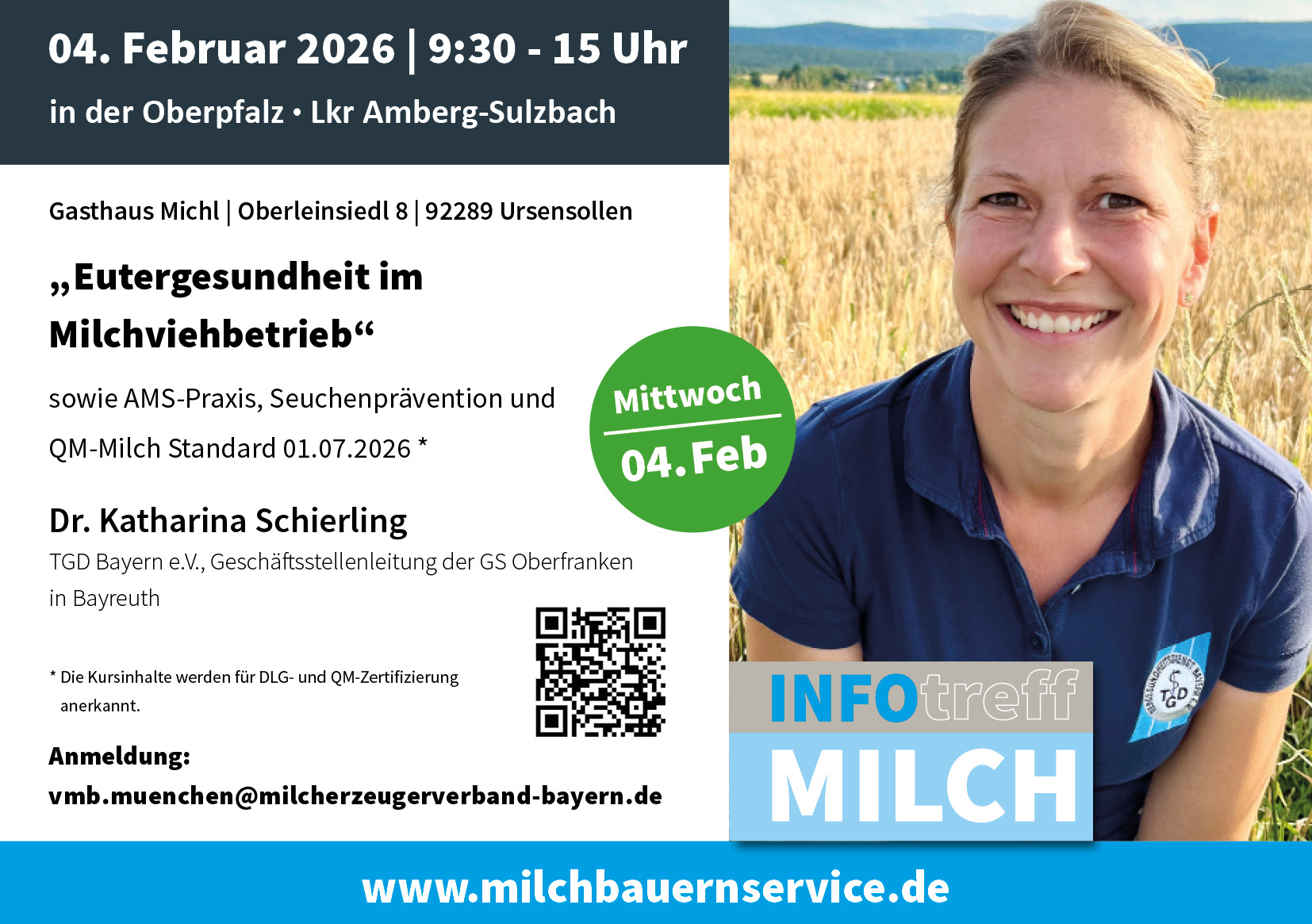 | 04.02.2026 | “Eutergesundheit im Milchviehbetrieb – AMS-Praxis, Seuchenprävention und QM-Milch Standard 01.07.2026” *, Dr. Katharina Schierling / Tiergesundheitsdienst Anmeldung erbeten per Mail: vmb.muenchen(a)milcherzeugerverband-bayern.de * Die Kursinhalte werden für DLG- und QM-Zertifizierung anerkannt. | Gasthaus Michl, Oberleinsiedl 8, 92289 Ursensollen |