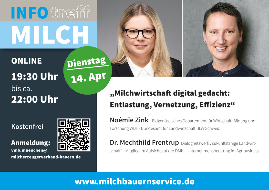 | 18.03.2026 | “QM-Milch im Umbruch – der neue Standard 2026” Marie Janson/MilchZert GmbH; 09:30 - 11:00 Uhr, Anmeldung per Mail: vmb.muenchen(a)milcherzeugerverband-bayern.de | online |