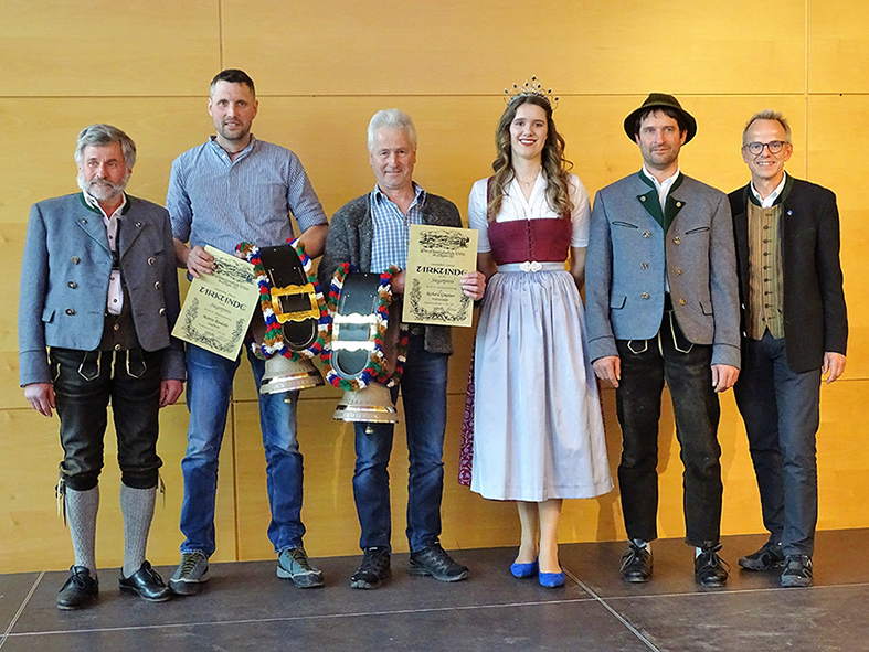 Dier Bayerische Milchprinzessin Philomena Mögele überreichte zusammen mit dem 1. Vorsitzenden des Alpwirtschaftlichen Vereins Franz Hage und dem 2. Vorsitzenden Christian Brutscher die Siegerurkunden und Kuhglocken an die Preisträger.