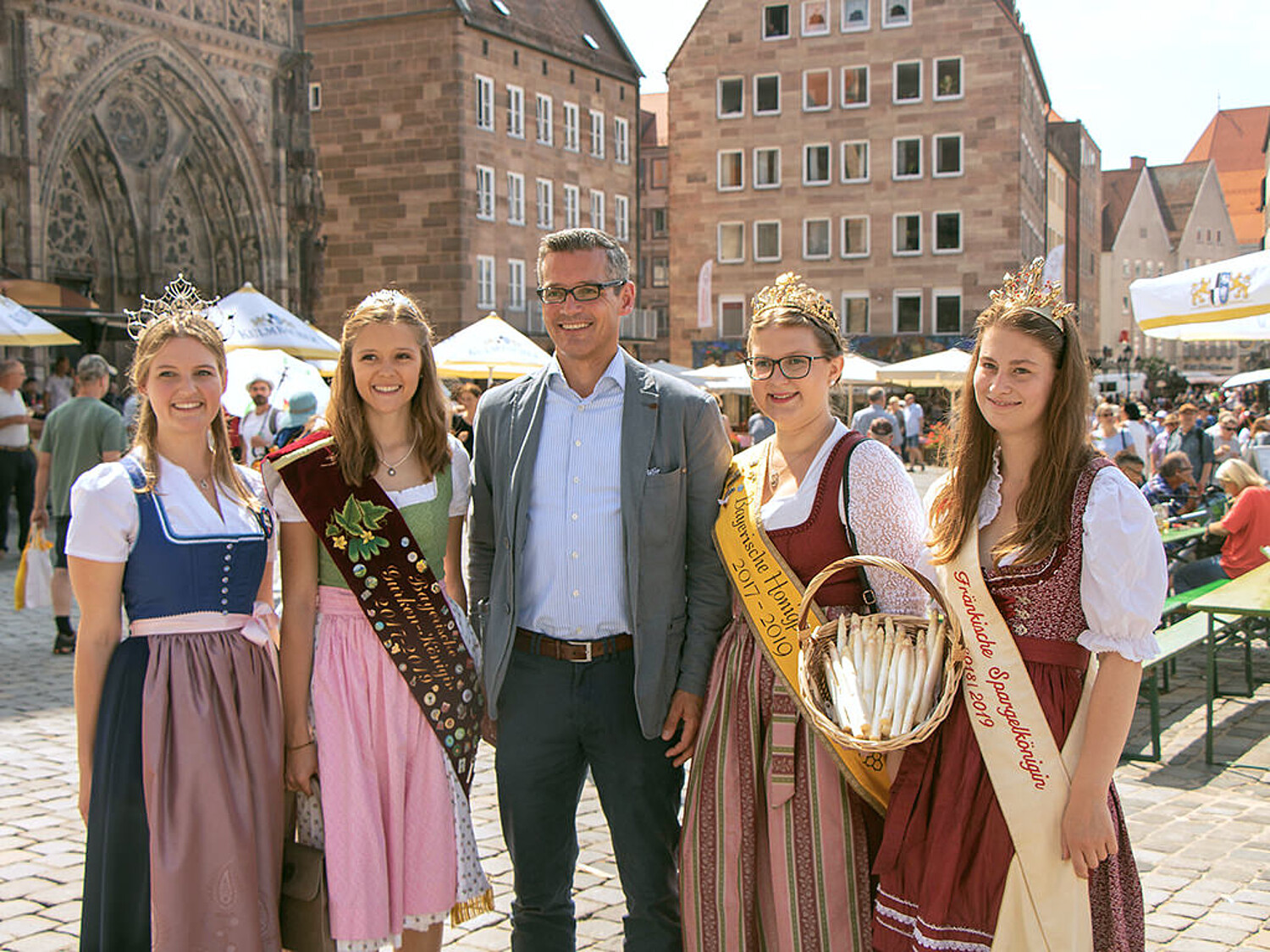 Bild mitte: Wirtschaftsreferent der Stadt Nürnberg Dr. Michael Fraas mit Milchprinzessin Miriam Weiß und weiteren Produktbotschafterinnen