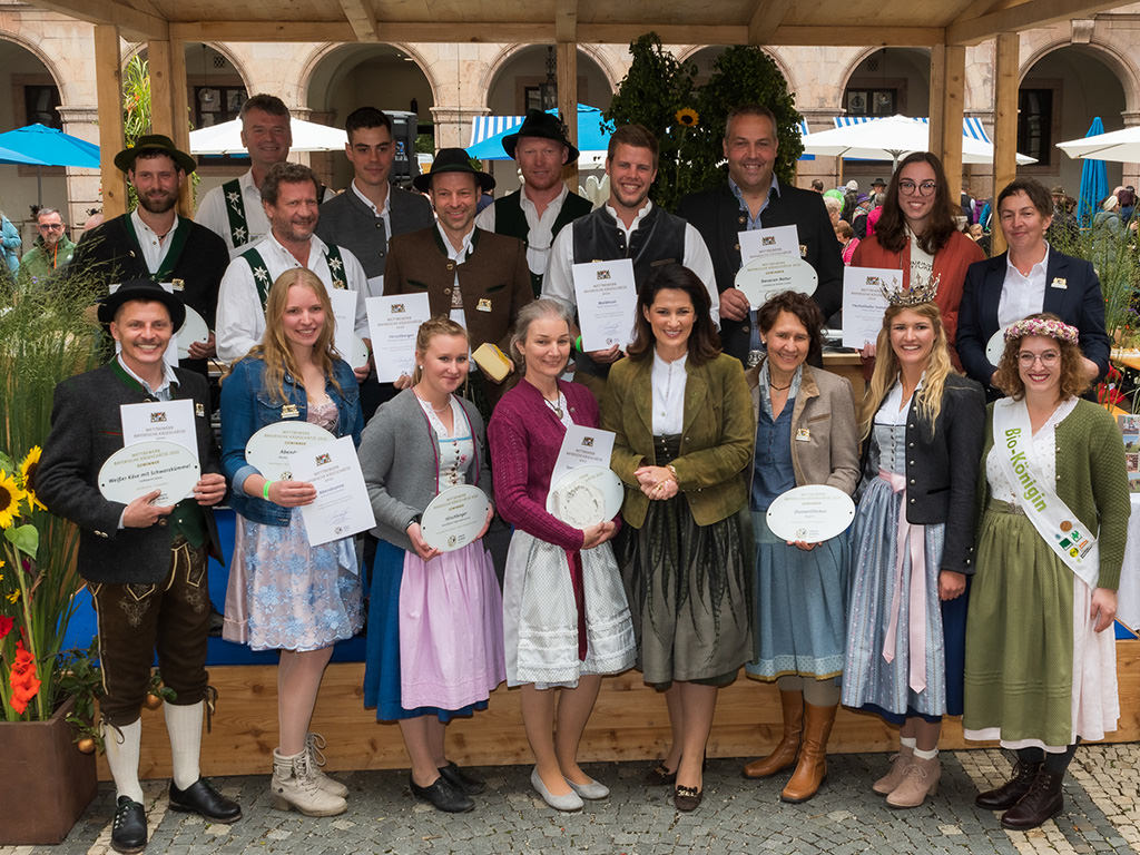 Die Bayerische Milchkönigin Veronika Gschoßmann gratulierte den 14 kleinen Käsereien aus ganz Bayern für ihre prämierten exzellenten Käsen. Auf dem Käse-Genussmarkt im Schmuckhof des Bayerischen Landwirtschaftsministeriums überreichte Landwirtschaftsministerin Michaela Kaniber den Preisträgern die Auszeichnungen. Prämiert wurden Weichkäse und halbfester Schnittkäse, Schnitt- und Hartkäse aus handwerklichen Käsereien aus Oberbayern, Schwaben, der Oberpfalz, Mittel- und Unterfranken. Eine Expertenjury aus Sensorikern und Sommeliers hatte die eingereichten Spezialitäten nach Aussehen, Geruch, Geschmack und Beschaffenheit bewertet. Darüber hinaus gab es noch drei Sonderpreise in den Kategorien „Innovation“, "Tradition" sowie "Käse in Öl". Damit wurden Kreationen gewürdigt, die eine neue Idee, welche ein traditionelles syrisches Rezept mit handwerklicher Herstellungsweise und bayerische Milch vereint, die Wiederentdeckung eines althergebrachten Klassikers der alpenländischen Käsekultur und einen Käsegenuss, der den Geschmack des Sommers einfängt.