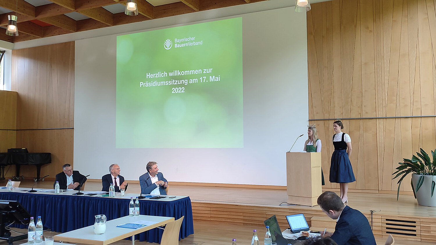 Veronika Gschoßmann (Bayerische Milchkönigin) und Philomena Mögele (Bayerische Milchprinzessin) starteten ihren ersten Antrittsbesuch mit der Präsidiumssitzung des Bayerischen Bauernverbandes am 17. Mai in Herrsching. Die beiden Milchhoheiten wurden im Haus der bayerischen Landwirtschaft herzlich begrüßt. So konnten die beiden frisch gewählten Milchbotschafterinnen gleich alle wichtigen Funktionäre im BBV auf einmal kennenlernen: Walter Heidl, Präsident des Bayerischen Bauernverbandes (3.v.l.), Landesbäuerin Anneliese Göller (rechts im Bild), Milchpräsident Günther Felßner (links im Bild) sowie Wolfgang Scholz (VMB-Vorsitzender) und Alfred Enderle (BBV/VMB), hintere Reihe, kennenlernen.