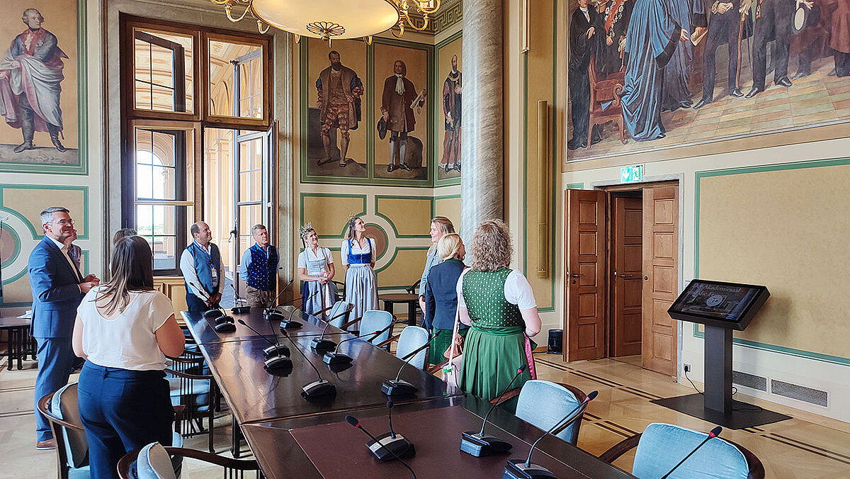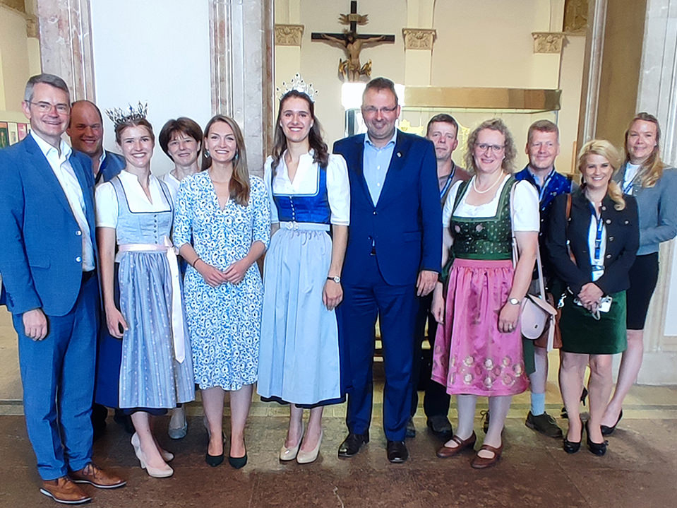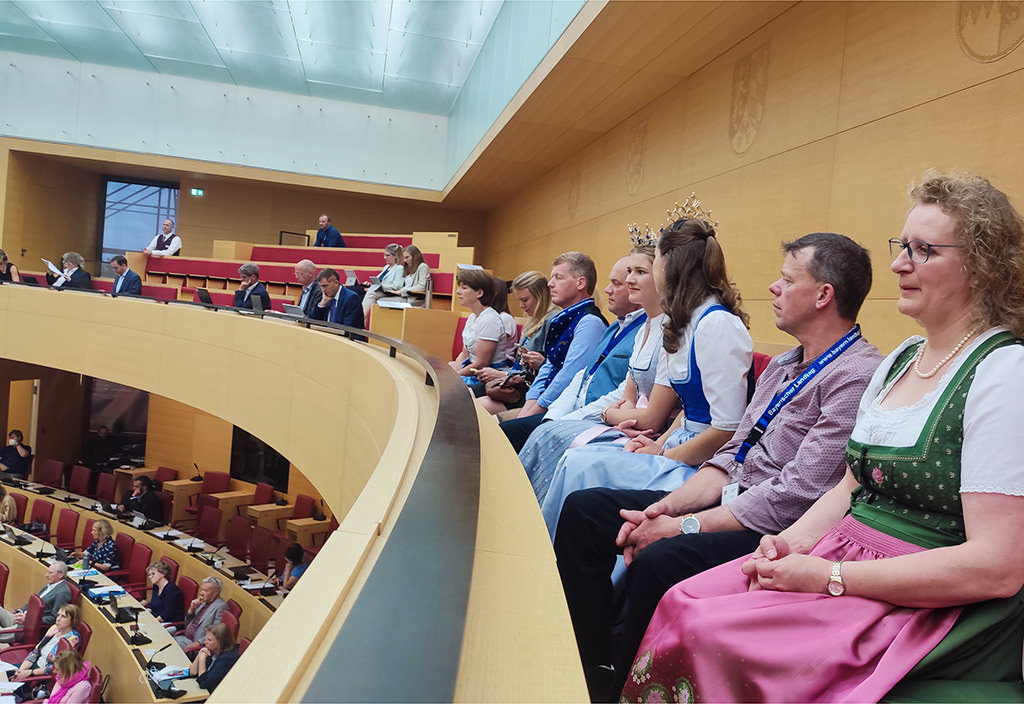 Auf Einladung von Peter Tomaschko, MdL, durften die Bayerische Milchhoheiten mit ihren Familien und einer Abordnung aus der Heimatgemeinde der Bayerischen Milchkönigin vergangene Woche den Bayerischen Landtag im Maximilianeum besuchen. Nach einer Führung durch Herrn Tomaschko hatten sie die Gelegenheit, eine Sitzung im Plenum live zu verfolgen. Dabei begrüßte der stellvertretende Landtagspräsident Karl Freller die Milchhoheiten als Ehrengäste vor den Abgeordneten. Neben einigen Landtagsabgeordneten - auch aus der Heimatregion - war es eine besondere Ehre, Landtagspräsidentin Ilse Aigner und einige bayerische Minister:innen persönlich kennenzulernen.