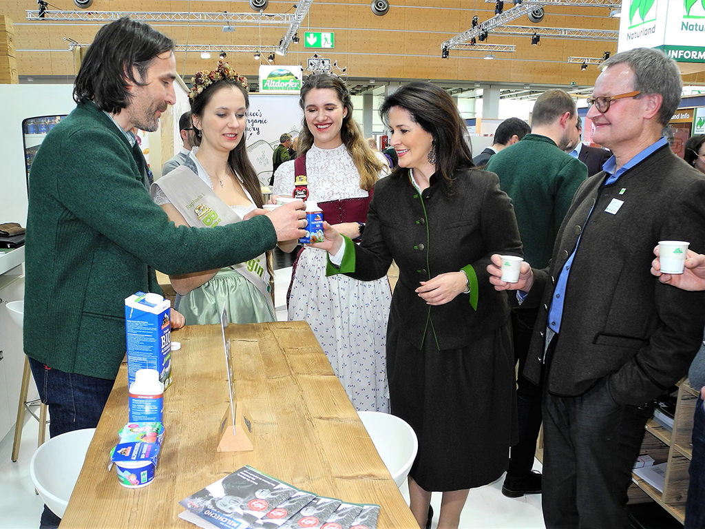 Vom 14.-17.02.2023 fand in Nürnberg die Biofach - die Leitmesse rund um das Thema Bio-Lebensmittel - wieder in Präsenz statt. Laut Angaben der Nürnberg Messe haben insgesamt 36.000 Fachbesucher aus 135 Ländern die 2.700 Aussteller aus über 100 Ländern besucht. Der ökologische Landbau in Bayern ist im vergangenen Jahr zwar weiter angewachsen. Rund 300 weitere Landwirtschaftsbetriebe mit insgesamt rund 7.000 Hektar Fläche haben auf ökologische Bewirtschaftung umgestellt. Die Anzahl der Ökobetriebe in Bayern liegt nun bei fast 12.000, sie bewirtschaften insgesamt nahezu 415.000 Hektar Fläche nach den Vorgaben des Ökolandbaus. Damit verfügt Bayern bundesweit weiterhin über die mit Abstand größte Ökofläche und die meisten Ökobetriebe. Der Anteil des Ökolandbaus an der Landwirtschaftsfläche in Bayern liegt derzeit noch bei 13 Prozent, und rund jeder dritte deutsche Ökobetrieb wirtschaftet im Freistaat. Die Bayerische Milchprinzessin Philomena Mögele nutzte auf ihrem Rundgang die Gelegenheit, die Produktneuheiten der bayerischen Aussteller (der Molkerei Berchtesgadener Land, der Bayerischen Milchindustrie, der Champignon-Hofmeister Unternehmensgruppe mit der Produklinie Alpavit, der Käse-Rebellen und der Weißenhorner Molkerei) und deren Produktlinien kennenzulernen.