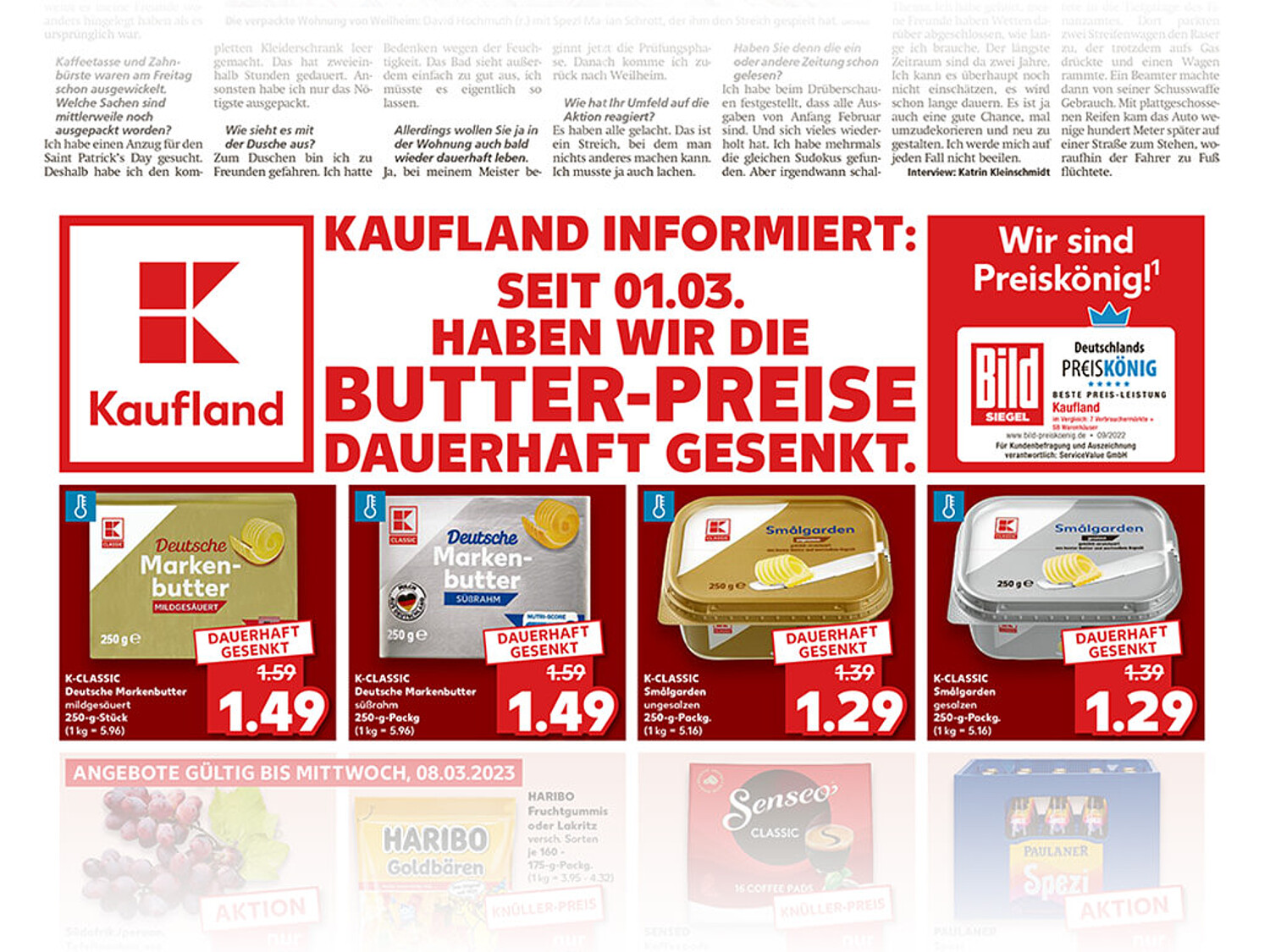 Zum 1. März hat der deutsche Lebensmitteleinzelhandel (LEH) die Endverbraucherpreise (EVP) für Deutsche Markenbutter im Preiseinstiegsbereich erneut gesenkt: Über die von Branchenprimus Aldi - mitten im laufenden Kontrakt - kurz vor Weihnachten 2022 vorgenommene Senkung des EVP von 2,29 Euro auf 1,99 Euro/250 g haben wir seitens des VMB ebenso berichtet wie über die deutlichere Rücknahme zu Beginn der neuen Kontraktlaufzeit "pünktlich" zum 1. Februar 2023, von 1,99 Euro auf 1,59 Euro/250 g. Jetzt also eine erneute Reduzierung des EVP um weitere, vergleichsweise marginale 10 Cent auf 1,49 Euro/250 g - und die allgemeinen Medien berichten in einem Maße über diese Preisanpassung, wie es bei weitem nicht "verhältinismäßig" ist. Aber Butter ist eben für alle ein Thema: Allen veganen Unkenrufen zum Trotz für die meisten Verbraucher als "Eckartikel" des wöchentlichen Einkaufs, im vergangenen Jahr als vermeintliches Leitbild der Teuerung und somit der Inflation durch den Mopro-Bereich, als die EVP im Preiseinstiegssegment auf bis zu 2,29 Euro und bei Markenartiklern auf bis zu 3,49 Euro/250 g angestiegen sind. Und für den LEH dient genau aus diesen Gründen Butter als unverzichtbares Lockmittel, um die Kunden von der eigenen "Preisgünstigkeit" zu überzeugen. Kurz gesprochen: Beim Kampf um Marktanteile dient - martialisch ausgedrückt - Butter als willkommene Waffe, wofür der LEH mehr oder weniger gerne auf eigene Marge verzichtet, um die Gesamtnachfrage im eigenen Haus positiv anzukurbeln. Erster Schritt dabei: Der preisbewußte Kunde muss zumindest die richtige Türe finden. Und das ist in Zeiten von negativen Nachrichten über den Preisanstieg bei anderen Lebensmitteln, aktuell bei Obst und vor allem von - nicht saisonalem - Gemüse nicht ganz unwichtig.