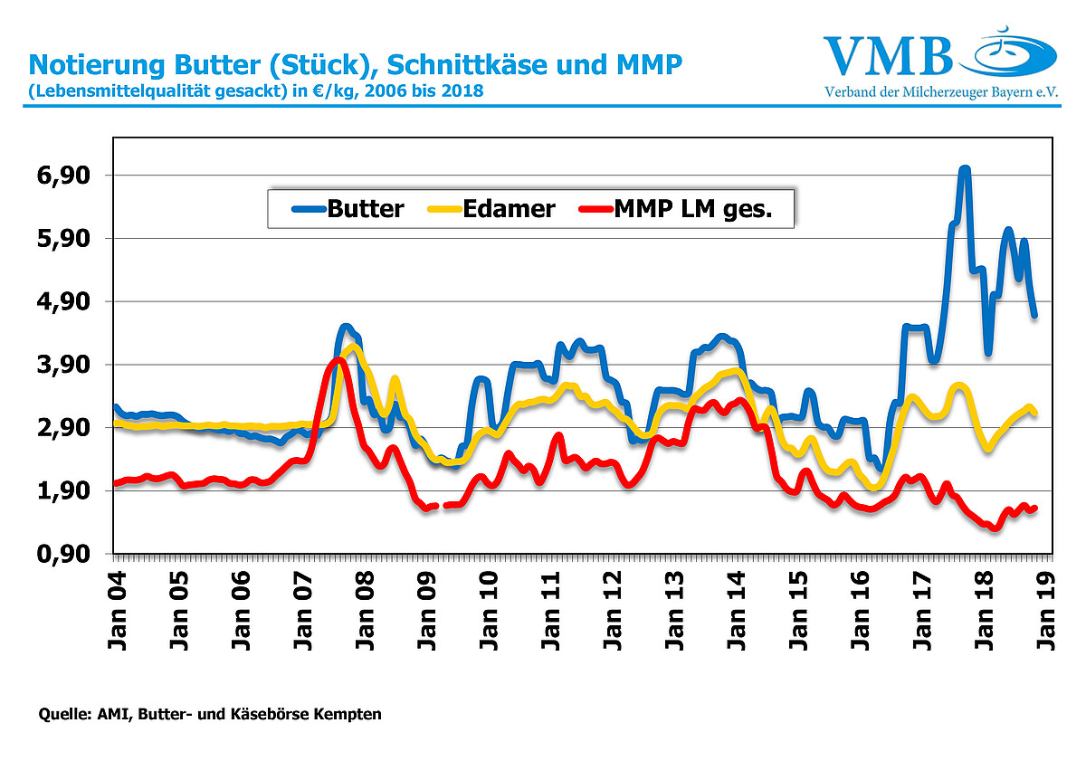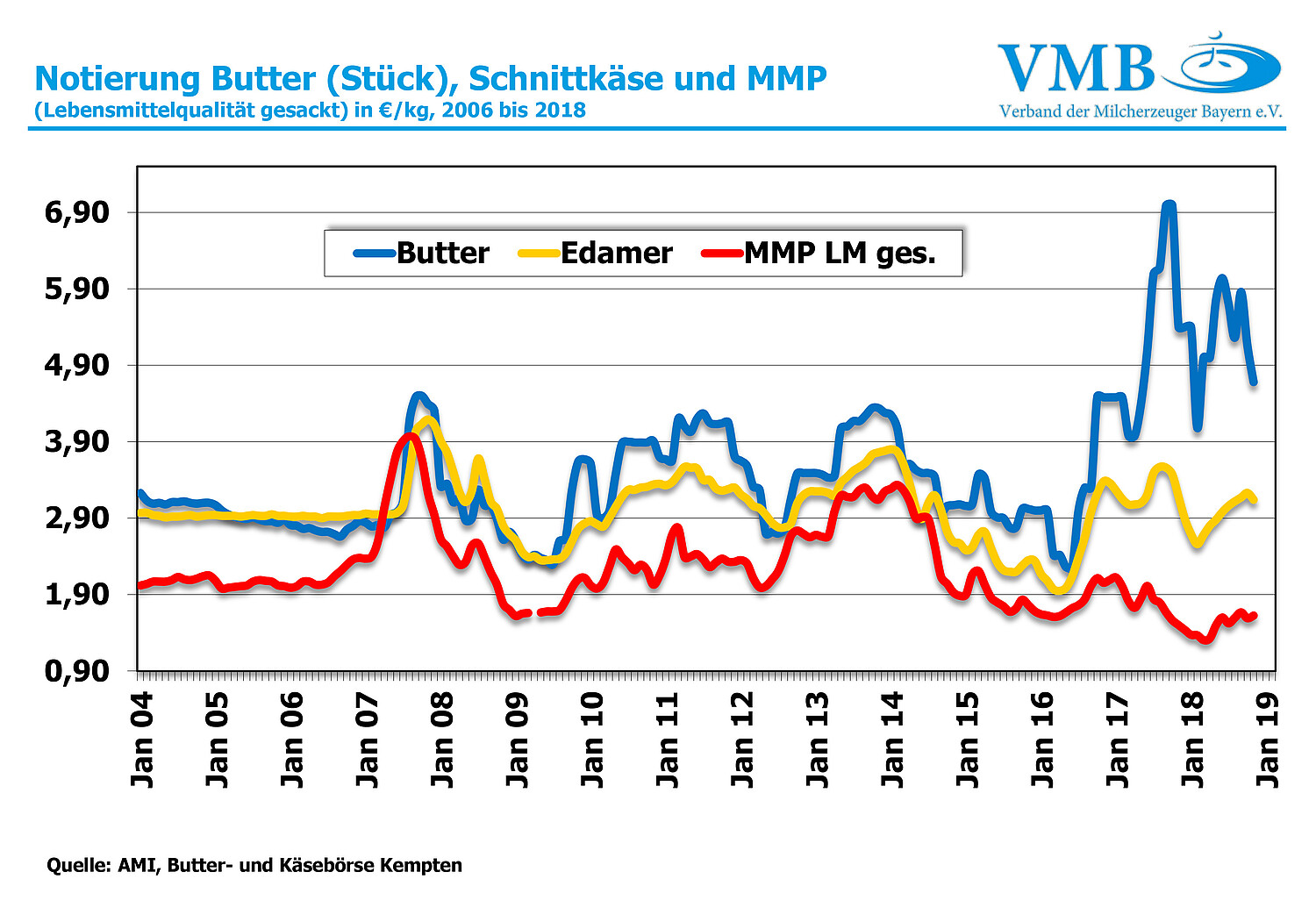 Die Diskussion über die Folgen der Wetterkapriolen und die Verhandlungen der neuen Handelspreise, hat im Herbst sehr zeitig begonnen. Die Erwartung der Landwirte war dementsprechend hoch. Allerdings hatten sich die Milcherzeugungsmengen schon wieder erholt. In Deutschland wie auch in Europa blieben die Milchanlieferungen nur leicht unter den Vorjahresmengen. Dies wiederum ermöglichte den Molkereien eine doch nicht so optimale Verhandlungsposition, um die Handelspreise anzuheben zu können. Infolgedessen zogen sich die Verkaufsgespräche über einen längeren Zeitraum hin. Des Weiteren bestanden gegenüber dem Handel noch mittelfristige Kontrakte (Käse und Frischprodukte), die bis fast zum Jahresende gültig waren. Infolgedessen zeigten die meisten Preise für Milchprodukte nur ein gleichbleibendes Niveau. Die Butterpreise wurden, vor dem eigentlich florierenden Weihnachtsgeschäfts, zweimal abgesenkt. Bis Januar 2019 bleiben diese allerdings nun unverändert.