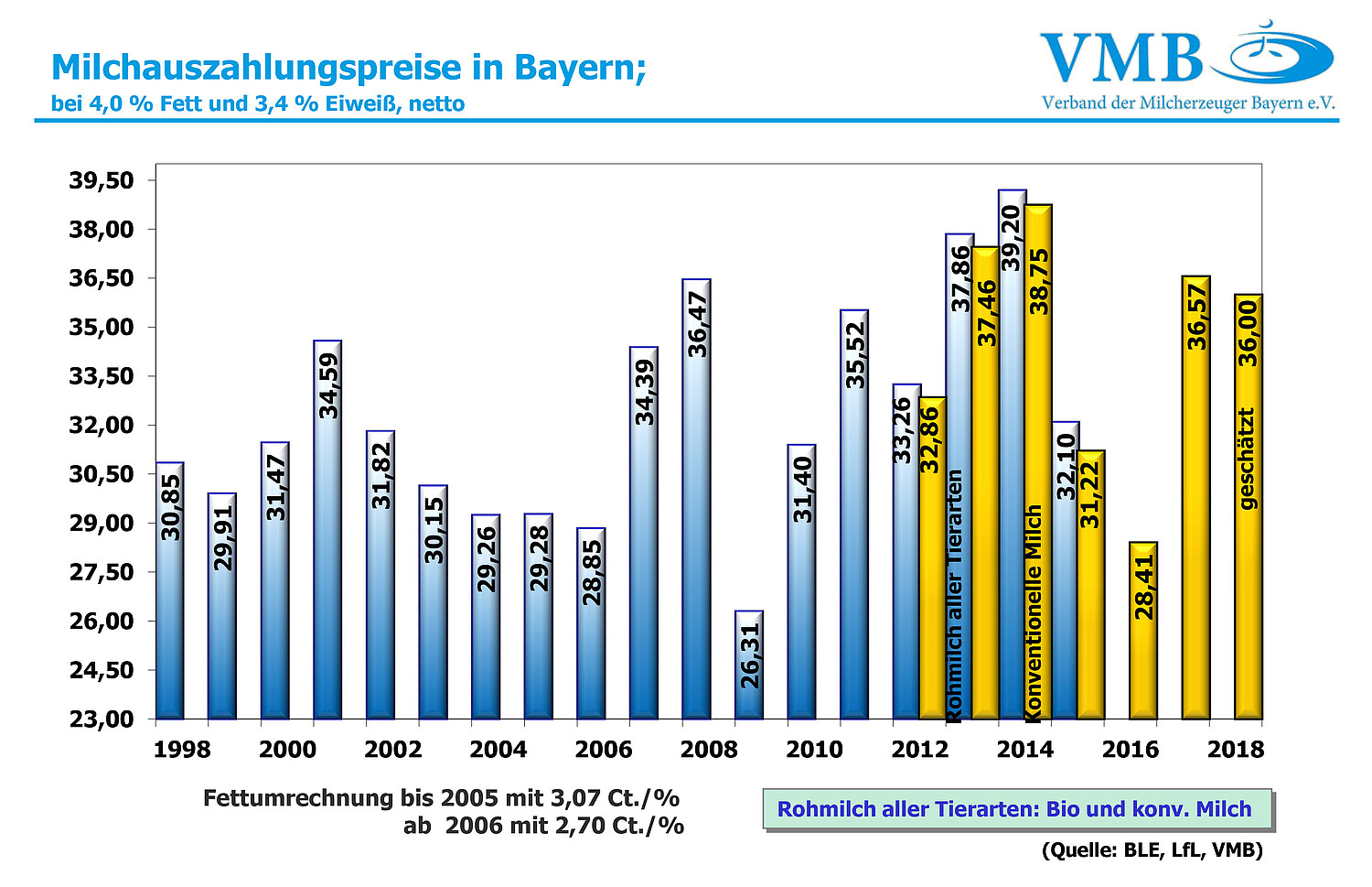 In der Analyse der Marktentwicklung 2018 lagen die Krisenbefürchtungen und die positiven Erwartungen sehr eng bei einander. Die nationalen wie internationalen Handelsplattformen verzeichneten nicht immer eine gleichlaufende Entwicklung. Die Märkte reagieren gewöhnlich immer in einem zeitlich Abstand, sei es auf unseren Kontinent oder global. Daher können, als Konsequenz, verlässliche Milchpreisbetrachtungen nur über einen kurzen Zeitraum erfolgen. Die Erlösbewegungen 2018 in Bayern waren (bei konventioneller Milch und oGT-Milch; 4,0 % Fett, 3,4 % Eiweiß pro kg, netto) zwischen Januar mit 37,50 Cent/kg, Tiefstand im Mai bei 34,00 Cent/kg und annähernd 36,00 Cent/kg Ende des Jahres. Der Gesamtpreis Bayern (mit Nachzahlung) für konventionelle Milch wird im Durchschnitt bei annähernd 36 Cent/kg Milch zu erwarten sein. Gegenüber dem Vorjahreswert bedeutet dies ein halbes Cent niedriger.
