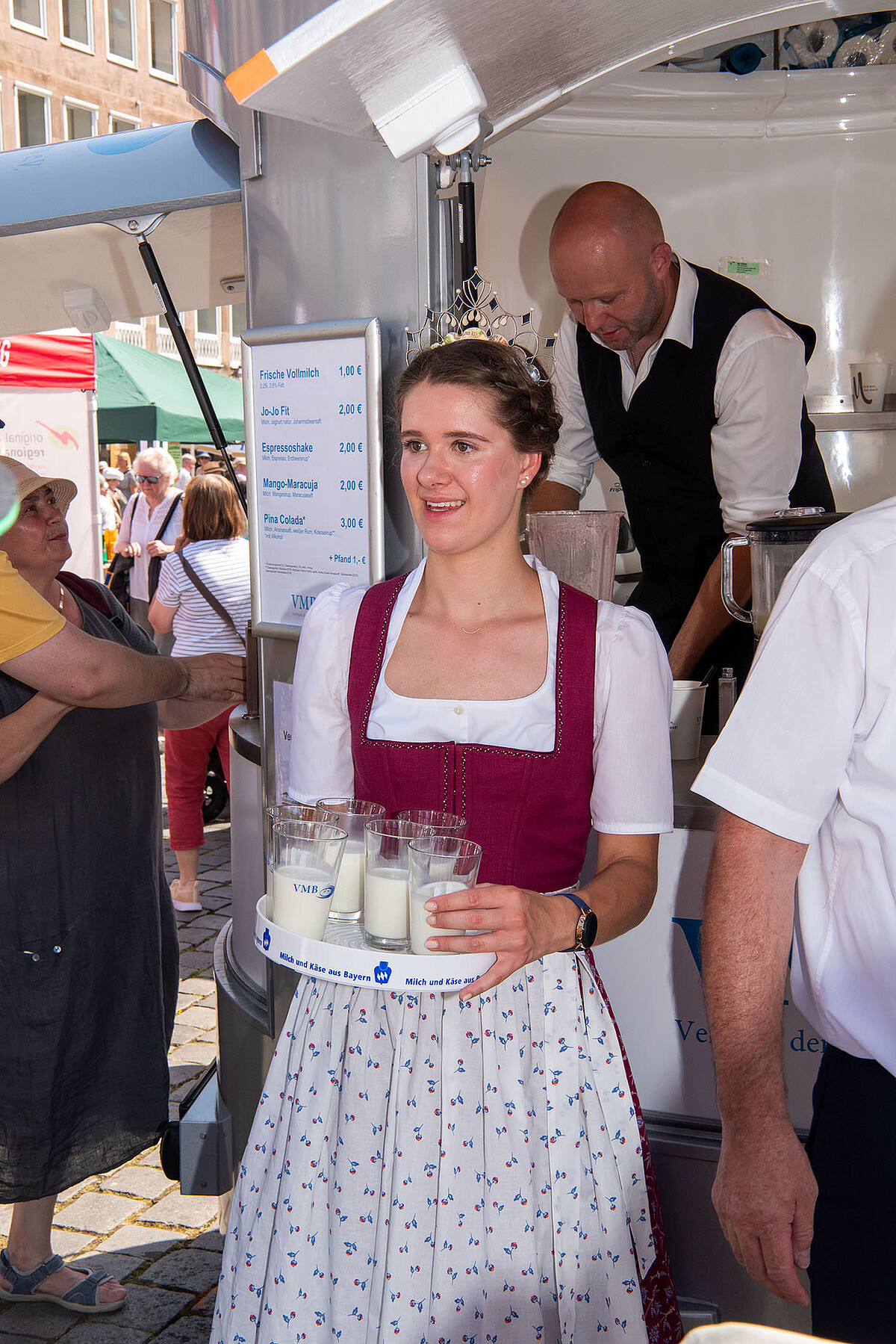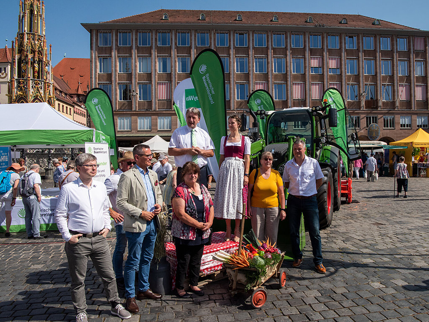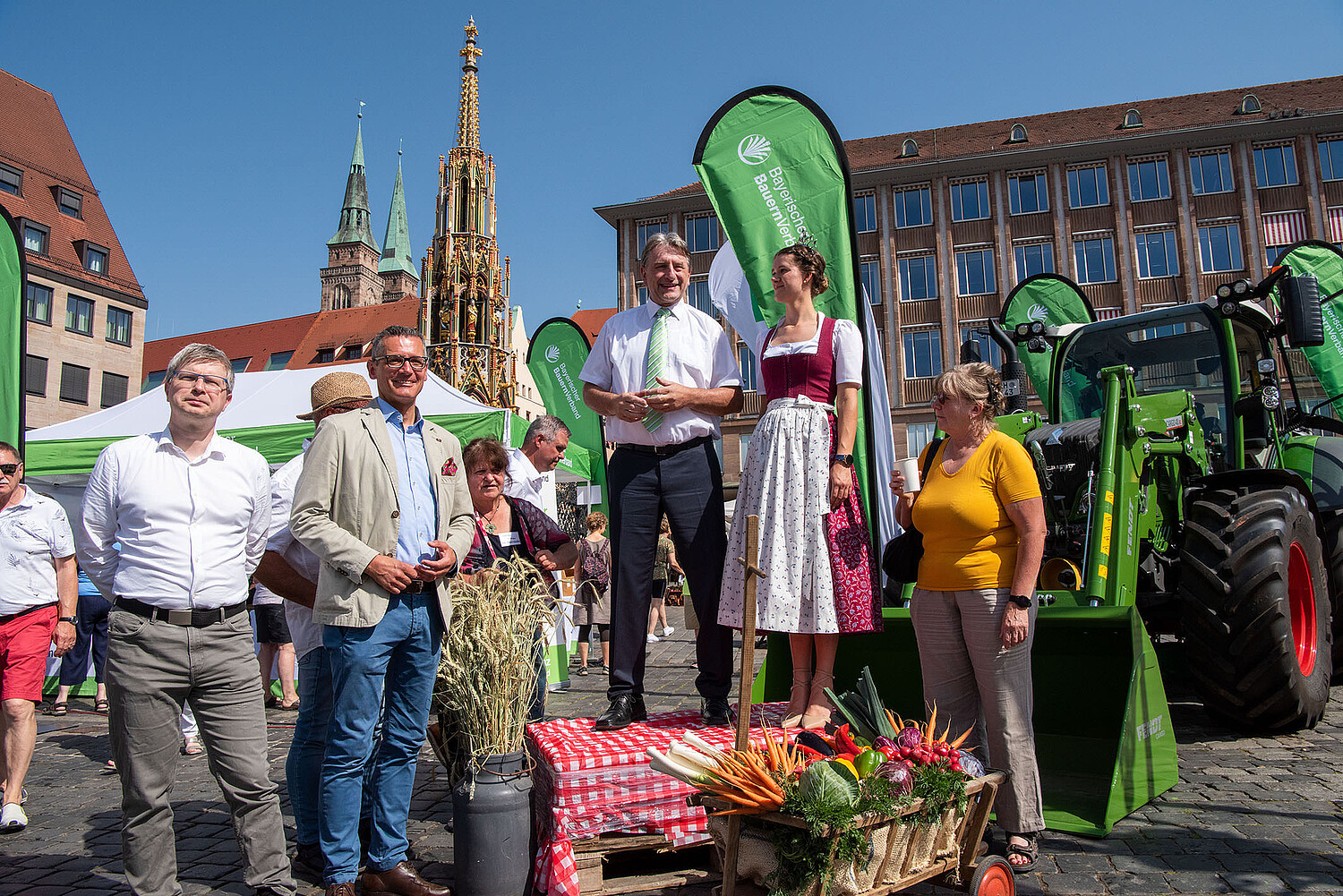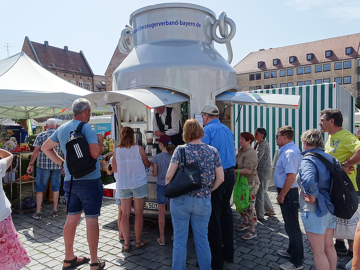 Mitten in Nürnberg, auf dem Hauptmarkt, boten am Sonntag, 19. Juni, zahlreiche Direktvermarkter ihre regionalen Waren an. „Hier findet Jede und Jeder etwas für seinen Geschmack. Doch es geht um viel mehr – hier kann man über den Genuss Heimat erleben“, sagt Günther Felßer, Milcherzeuger und Vizepräsident des Bayerischen Bauernverbandes. „Egal ob herzhaft, süß, zum Reinbeißen oder flüssig – jeder Mensch hat doch irgendetwas, das Heimatgefühl vermittelt. Hier auf dem Hauptmarkt wird es Wirklichkeit,“ betont Günther Felßner. Trotz des heißen Wetters kamen zahlreiche Verbraucher:innen zur Bauernmarktmeile und genossen die sommerliche und kulinarische Stimmung auf dem Bauernmarkt der Extraklasse. Besonders nachgefragt: Die frischen Milchcocktails an der überdimensionalen Milchkanne des VMB (Verband der Milcherzeuger Bayern). Die Bayerische Milchprinzessin Philomena Mögele war Ansprechpartnerin für die Marktbesucher:innen und zeigte unter anderem am Stand der Tegernseer Naturkäserei, was das Milchland Bayern kulinarisch zu bieten hat.