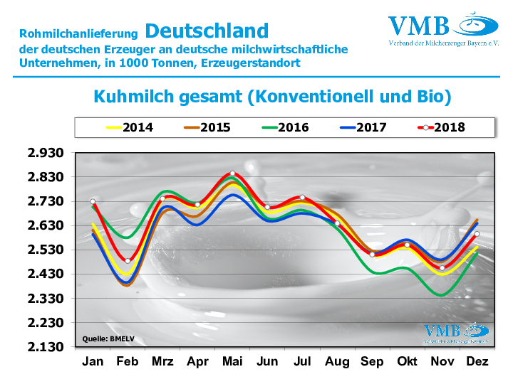 Jahresanlieferung 2018 - Höchstmenge erreicht | Die in Deutschland konventionell und ökologisch/biologisch erzeugte Milchmenge hat im Jahr 2018 den höchsten Stand erreicht. Die Rekordmenge beträgt 31,716 Milliarden Kilogramm, damit wurde ein Plus von 1,5 Prozent gegenüber dem Vorjahr erzielt. Selbst die hohe Anlieferung vom Jahr 2014 wird um gut 150 Millionen Kilogramm überschritten. Angesichts der zufrieden stellenden hohen züchterischen Leistungssteigerung 2018, mit über 300 kg Milch pro Kuh, ist es nicht verwunderlich, dass ein solch hohes Mengenpotential ermöglicht wurde. Aber eigentlich ließen die Witterungsumstände im zweiten Halbjahr 2018, mit extremer Hitze und langer Trockenheit, auf eine entgegengesetzte Milchanlieferung schließen. Das ansteigende Milchaufkommen wurde von der konventionellen wie ökologisch/biologischen Wirtschaftsweise gleichzeitig getragen.
