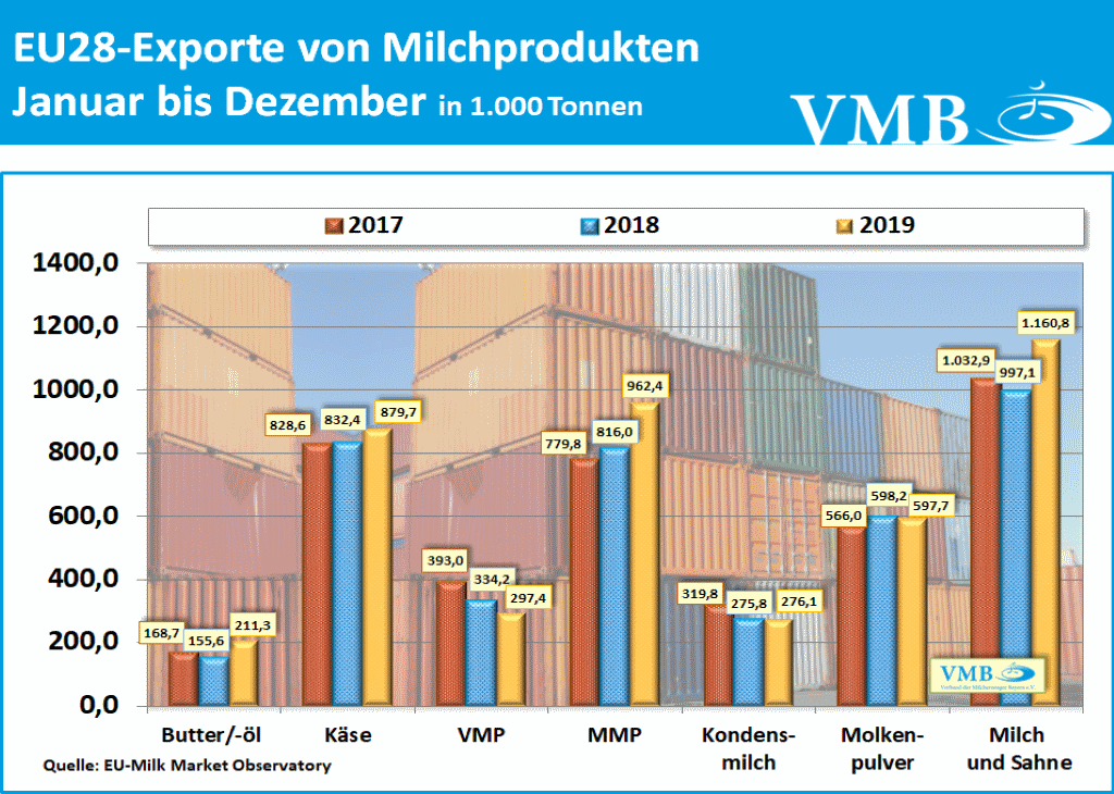 Die Observatoriumsstelle für Milch der Europäischen Union (EU Milk Market Observatory (MMO)) hat die Export-Bilanz für den Monat Dezember 2019, mit kumulierten Zahlen von Januar bis Dezember2019, veröffentlicht.