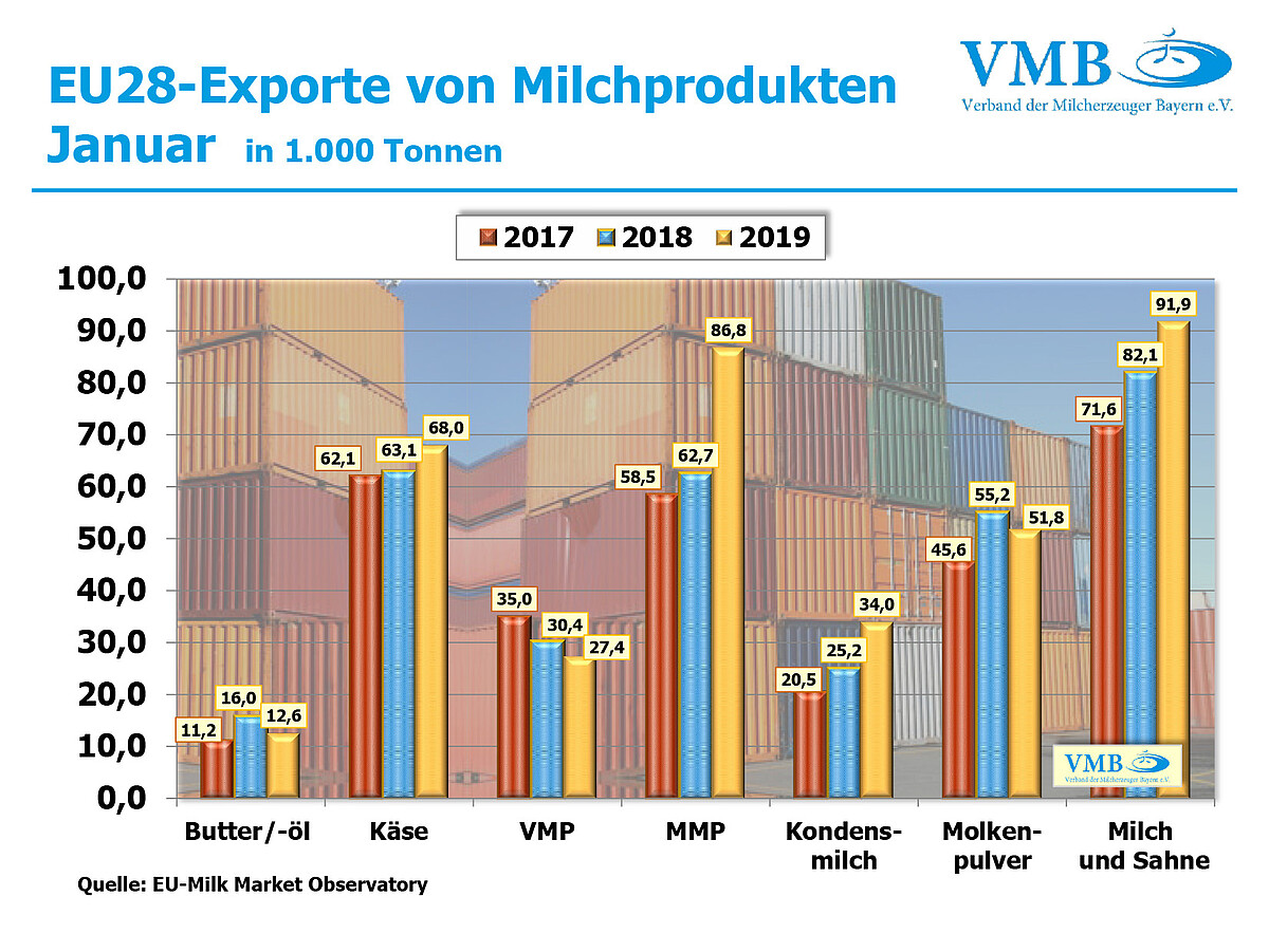 Für den Monat Januar 2019 hat die Observatoriumsstelle für Milch der Europäischen Union (EU Milk Market Observatory (MMO)) die Export-Bilanz veröffentlicht. Für den Jahresbeginn verkündet die Erhebung der MMO für den Monat Januar 2019 einen freundlichen Start. Nicht nur die Bereiche Käse und Magermilchpulver, die in den letzten Jahren die Stützen des EU-Exportgeschäftes gewesen sind, sondern auch Kondensmilch und Flüssigmilch haben laut den Berechnungen im Absatz zulegen können.