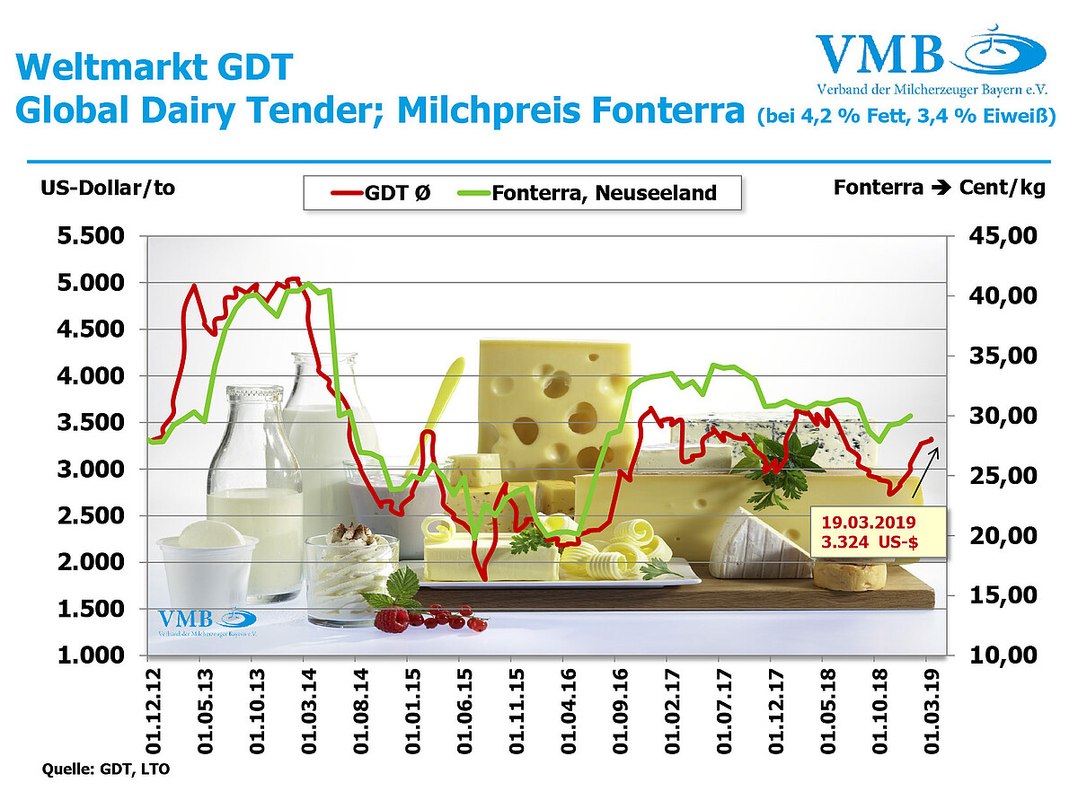 Dementsprechend hat der am Weltmarkt größte Anbieter, die neuseeländische Fonterra, das Milchpreisniveau vom Dezember 2018 im Januar 2019 um über ein halbes Cent erhöht. Folglich liegt der Milchpreis der Standardmilch nun bei annährend 30 Cent (4,2 % Fett, 3,4% Eiweiß, Ø 500 Tonnen pro Jahr, netto)