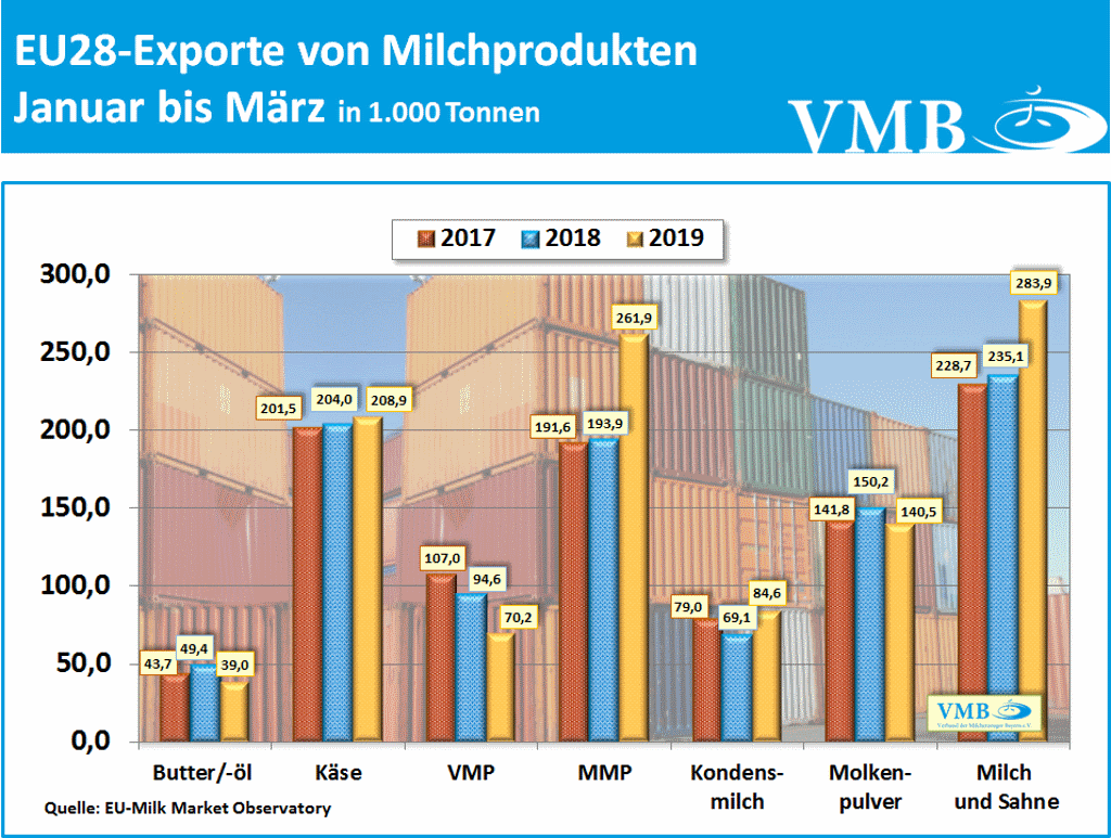 Die Observatoriumsstelle für Milch der Europäischen Union (EU Milk Market Observatory (MMO)) hat für den Monat März, beziehungsweise die Zahlen kumuliert von Januar bis März 2019, in ihrer Export-Bilanz veröffentlicht. Für das erste Quartal des Jahres 2019 zeigt die Erhebung der MMO weiterhin freundliche Exporthandelsgeschäfte der europäischen Union, mit guten Absatzmengen im Käse-, Magermilch-, sowie Kondensmilch- und Frischmilchbereich.