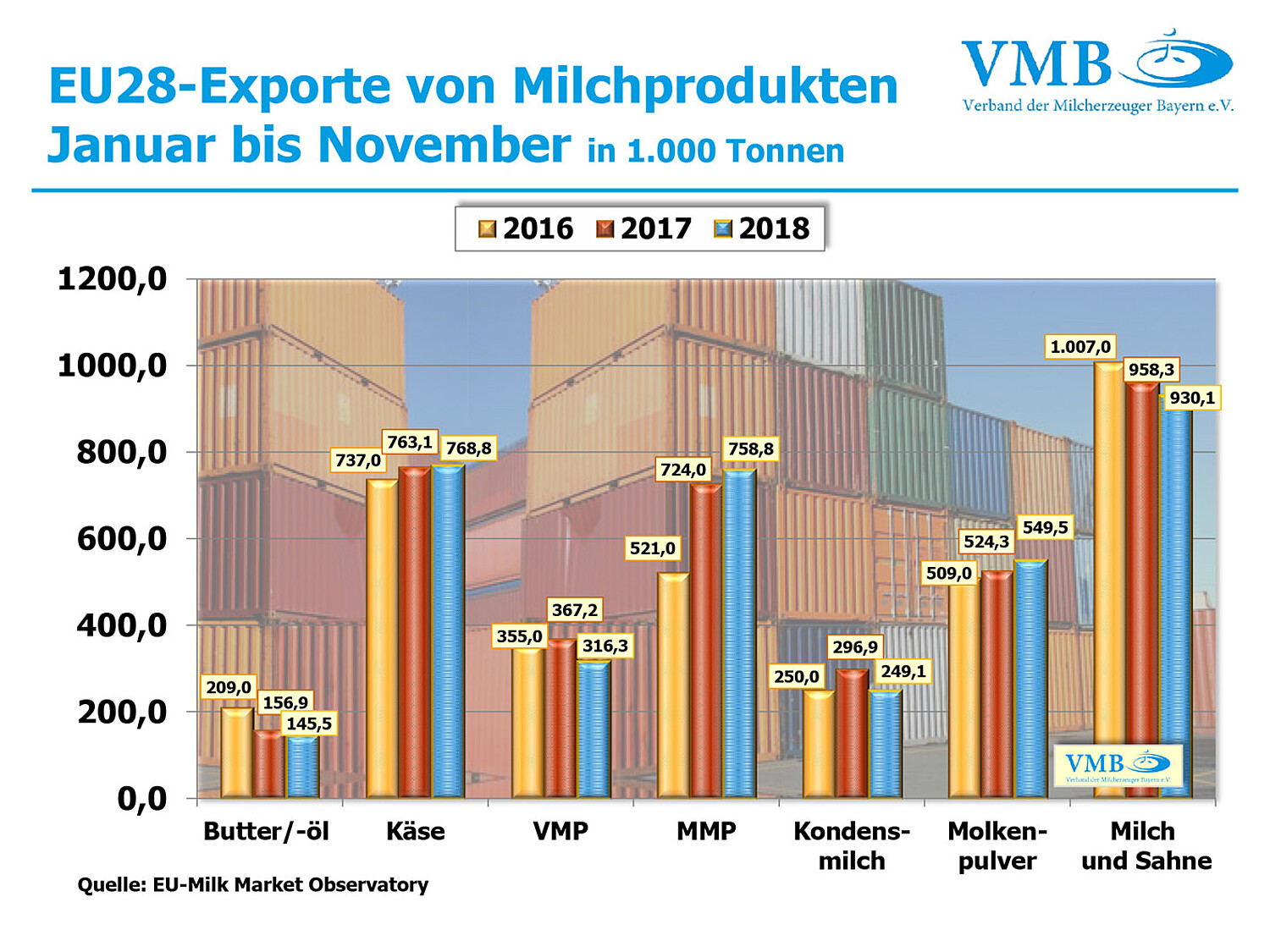 EU-28 Drittlandexport November 2018: Freundliches Absatzniveau | Für den Monat November 2018 hat die Observatoriumsstelle für Milch der Europäischen Union (EU Milk Market Observatory (MMO)) die Export-Bilanz veröffentlicht. Die vorletzte Monatserhebung für das Jahr 2018 zeigt, wie bereits in den vergangenen Monaten, weiterhin ein sehr freundliches Absatzniveau auf den Weltmärkten. Der Trend offenbart, dass zunehmend Käse und Magermilchpulver den Hauptanteil des Exportgeschäftes ausfüllen.
