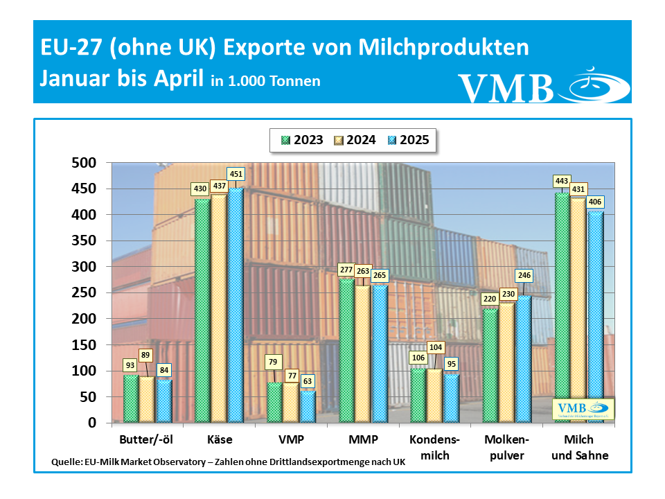 Die größten Schwierigkeiten bereitete der Export in Drittländer im Bereich von Vollmilchpulver. Mit einem Einbruch von 36 % im April wurde in den ersten vier Monaten dieses Jahres 19 % weniger exportiert als noch im Vorjahrszeitraum. Abnehmer aus China, Algerien und Südafrika führten wesentlich weniger Vollmilchpulver ein.