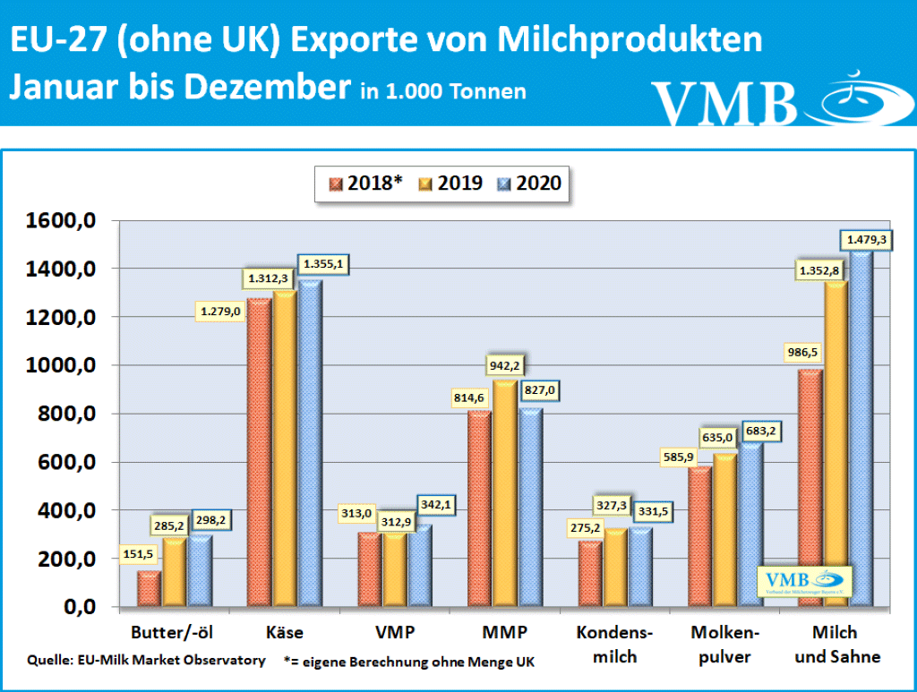 Die Vorjahresvergleichsrechnung hat bei den anderen gehandelten Milchprodukten positive Ergebnisse von über drei bis knapp zehn Prozent ergeben. Die größte Absatzmenge in Milchäquivalent bestand bei Käse. Hier wurden über 1,355 Millionen Tonnen gehandelt. Dies sind gegenüber den Vorjahreswerten mehr als 42.000 Tonnen bzw. 3,3 Prozent. Das hohe Volumen begründet sich aus der Tatsache, dass in der Statistik durch den BREXIT das Vereinigte Königreich (UK) als Drittland gewertet wird. United Kingdom importierte schon immer monatlich zwischen 30.000 bis 40.000 Tonnen Käseprodukte vom Kontinent. Zwar werden auch von der Europäischen Union Käsemengen aus dem Vereinigten Königreich importiert, aber dennoch zeigt der bereinigte Absatz, dass ist das Vereinigte Königreich ein wichtiger und interessanter Kunde ist. Für das europäische Käsegeschäft haben sich auch in den letzten Jahren gute Geschäftsbeziehungen in Japan entwickelt. Inzwischen verkaufen die europäischen Molkereien über 100.000 Tonnen auf dem japanischen Markt. Damit verfügen die japanischen Käseimportmengen über einen 40-prozentigen Marktanteil im Reich der aufgehenden Sonne.
