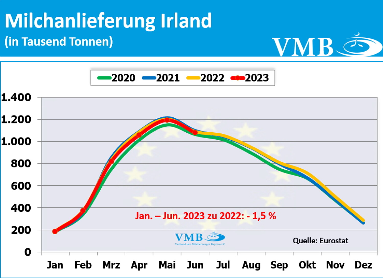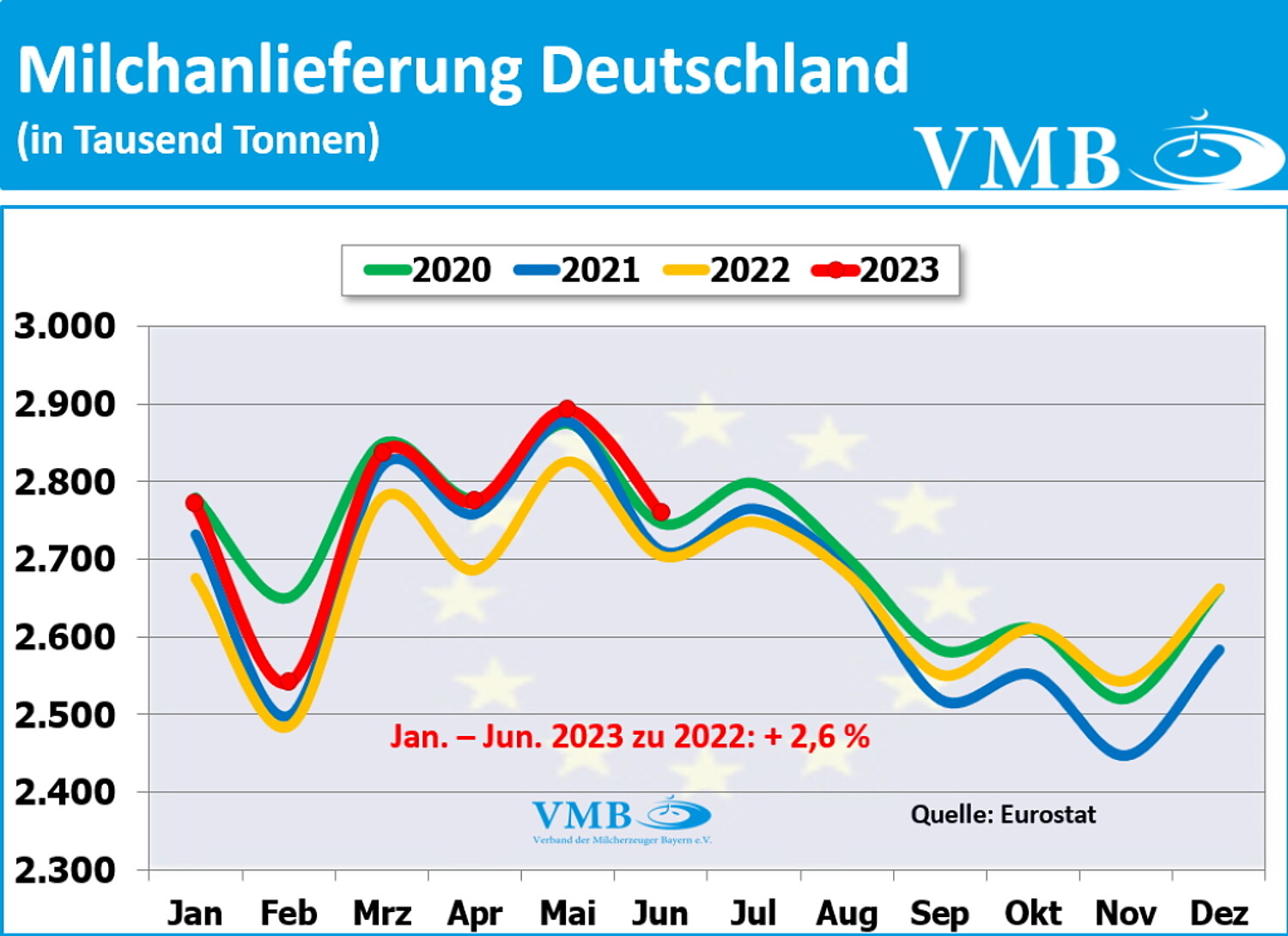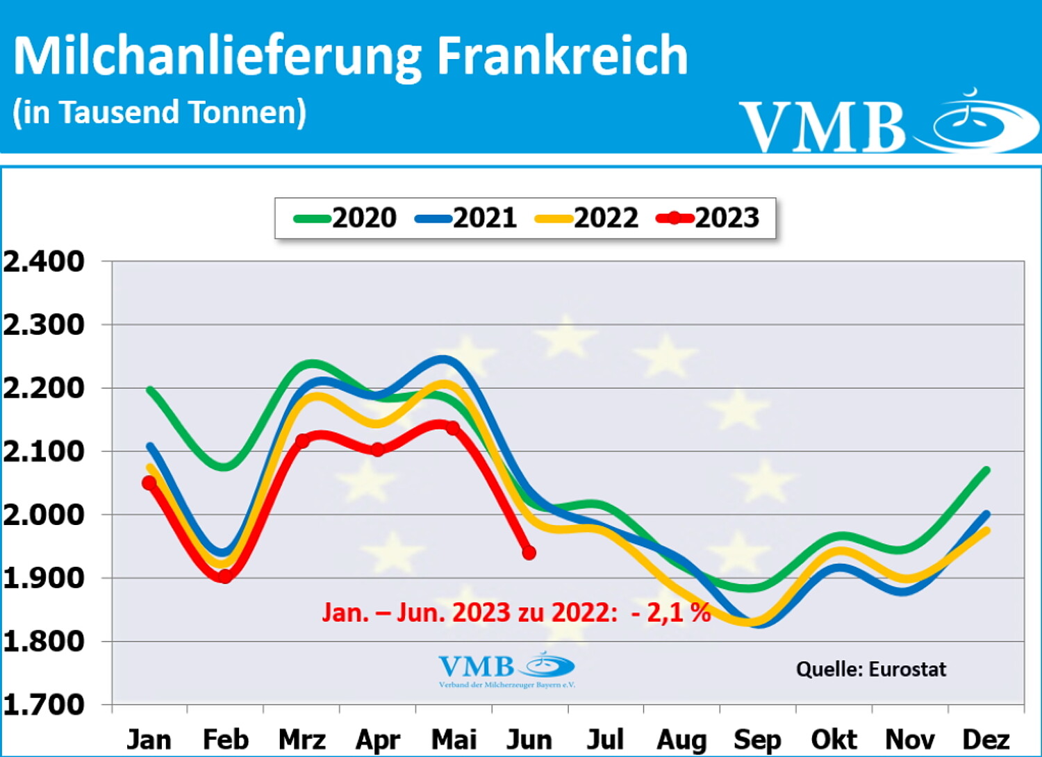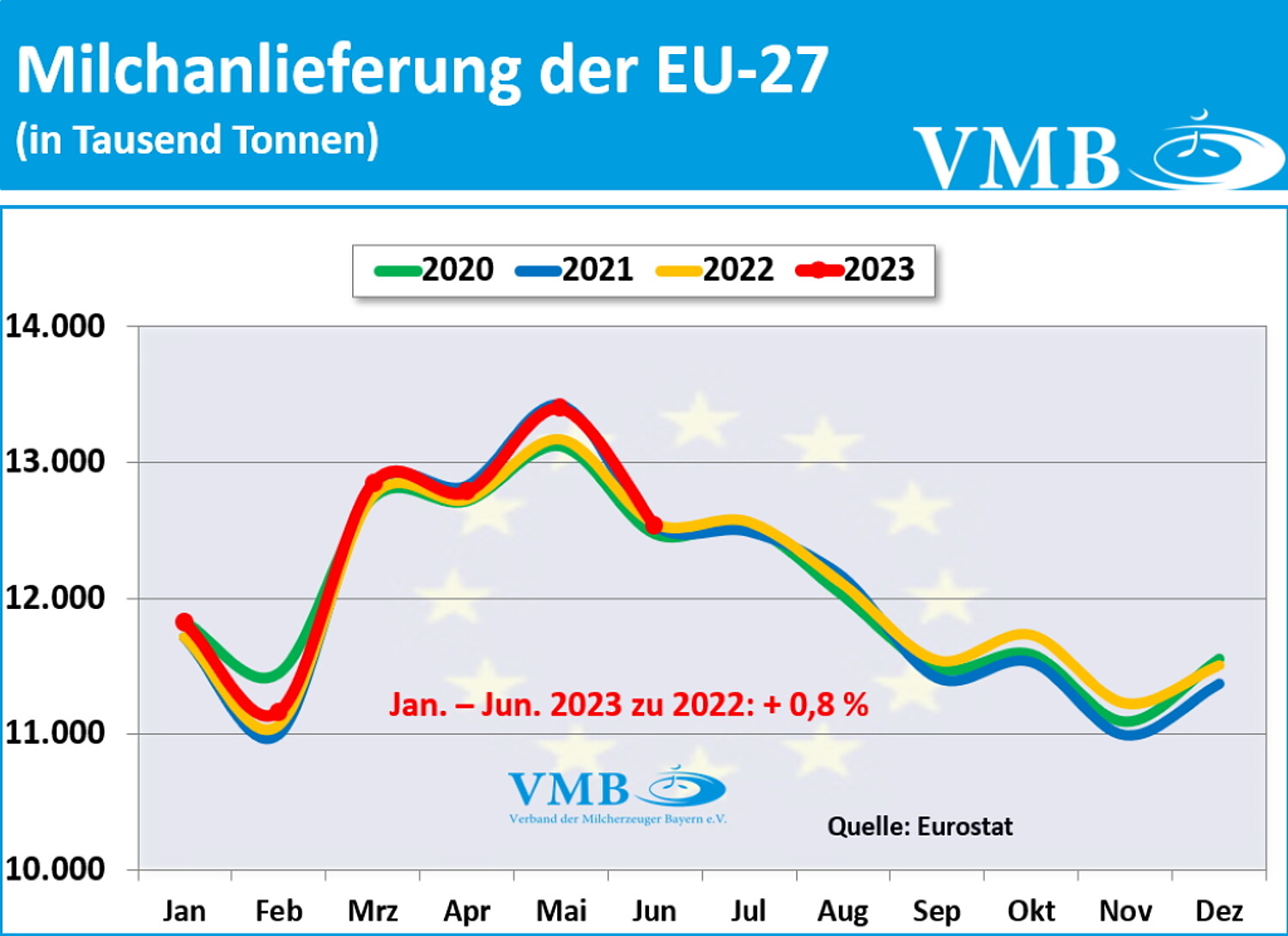 Vom Amt für Statistik der Europäischen Union wurden die Milcherzeugungsmengen der 27 EU-Staaten veröffentlicht. Das Vereinigte Königreich (United Kingdom) wird in der Auswertung extra aufgeführt. Die Daten werden bei Agriculture and Horticulture Development Board (AHDB) publiziert.