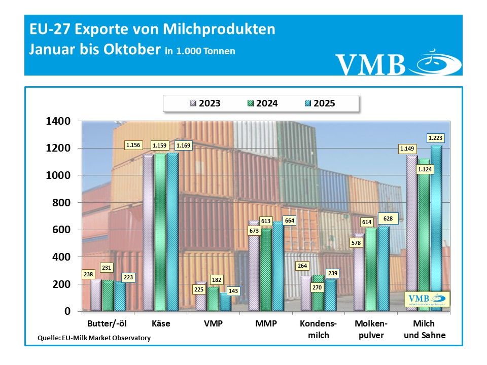 Nach einer verbesserten Nachfrage nach europäischen Milchprodukten im September, konnten im Oktober die Ausfuhren in Drittstaaten weiter gesteigert werden. Das Handelsvolumen, insbesondere von Magermilchpulver und Molkenpulver, bewegte sich deutlich über dem Vorjahresmonat. Auch die Lieferungen von Butter/-öl und Käse verspürten im Welthandel ein höheres Kaufinteresse. Verhalten entwickelte sich das Drittlandgeschäft mit Vollmilchpulver, die gehandelten Mengen lagen weiterhin hinter den Lieferungen von 2024 zurück.