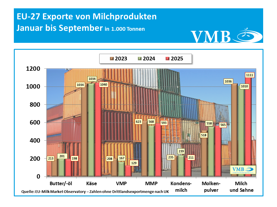 Nach einem zwischenzeitlichen deutlichen Rückgang der Käseausfuhren im August, zeigte sich für den September wieder ein höheres Absatzpotenzial. Dabei profitierten die europäischen Drittlandausfuhren, insbesondere von einem erhöhten Importbedarf des Vereinigten Königreichs. Rund 90 % der dortigen Käseeinfuhren stammen aus der EU-27. Im Vergleich zum September 2024 führte die EU um gut 4 % mehr Käse aus. Die kumulierte Handelsmenge von Januar bis September erreichte zum Vorjahreszeitraum ein leichtes Plus von rund 1,0 % und konnte sich somit auf sehr hohem Niveau behaupten. Der Handel mit Magermilchpulver setzte nach einem starken Einbruch des Handelsvolumens im Jahr 2024, die positive Entwicklung fort. Im September wurden die Lieferungen in Drittländer um rund 18 % übertroffen. Im Jahresverlauf konnten die Exporte nach Indonesien, Malaysia, Vietnam und Thailand stärker ausgebaut werden. Das Exportvolumen erreichte in den bisherigen neun Monaten ein um rund 4 % höheres Absatzniveau als im Vorjahreszeitraum.