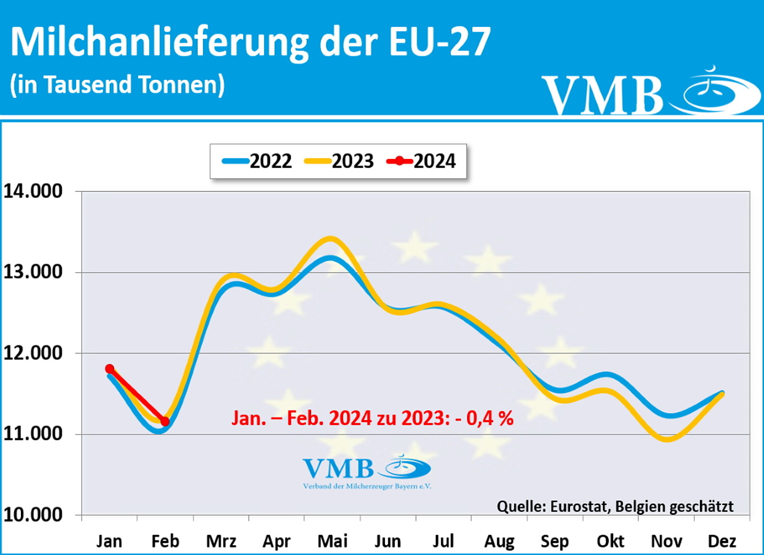 In der EU-27 wurde nach aktuellen Berechnungen von Eurostat im Februar eine Milchmenge von 11,55 Milliarden kg Milch erzeugt. Gegenüber Februar 2023 hatte sich die Anlieferungsmenge um rund 335 Millionen kg Milch bzw. 3,2 % erhöht. In diesem Jahr muss im Februar allerdings der Schalttag, als zusätzlicher Anlieferungstag, berücksichtigt werden. Kalenderbereinigt entspricht das europäische Milchaufkommen mit einem moderaten Minus von ca. 0,4 % nahezu dem Niveau des Vorjahresmonats. Kumuliert für die ersten beiden Monate bewegte sich die Milchmenge innerhalb der EU-27 um 0,3 % unter dem Vergleichszeitraum des Vorjahres. In den einzelnen Mitgliedstaaten war das Anlieferungsverhalten von einem uneinheitlichen Bild gezeichnet.