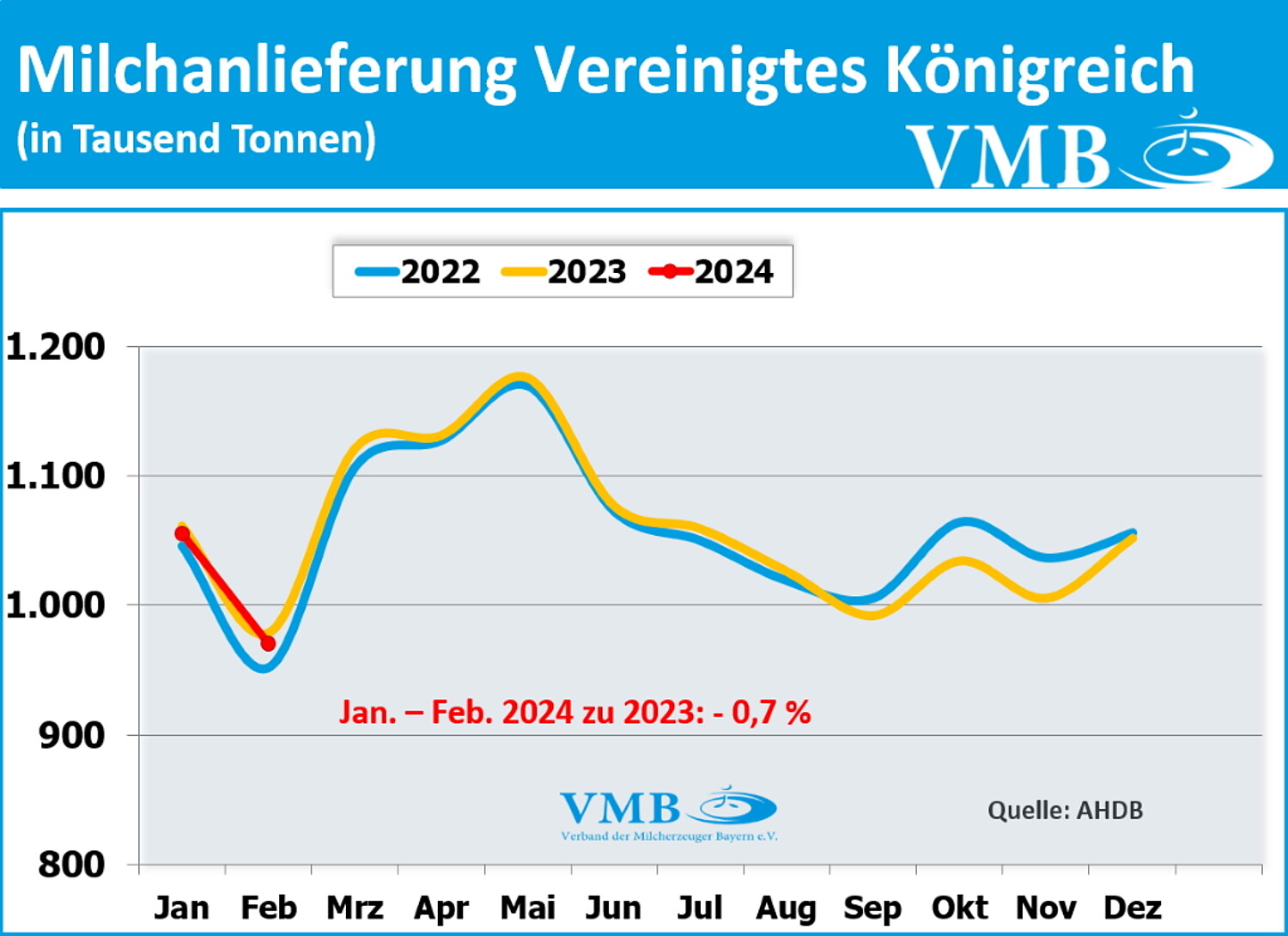 Vom Amt für Statistik der Europäischen Union wurden die Milcherzeugungsmengen der 27 EU-Staaten veröffentlicht. Das Vereinigte Königreich (United Kingdom) wird in der Auswertung extra aufgeführt. Die Daten werden bei Agriculture and Horticulture Development Board (AHDB) publiziert.
