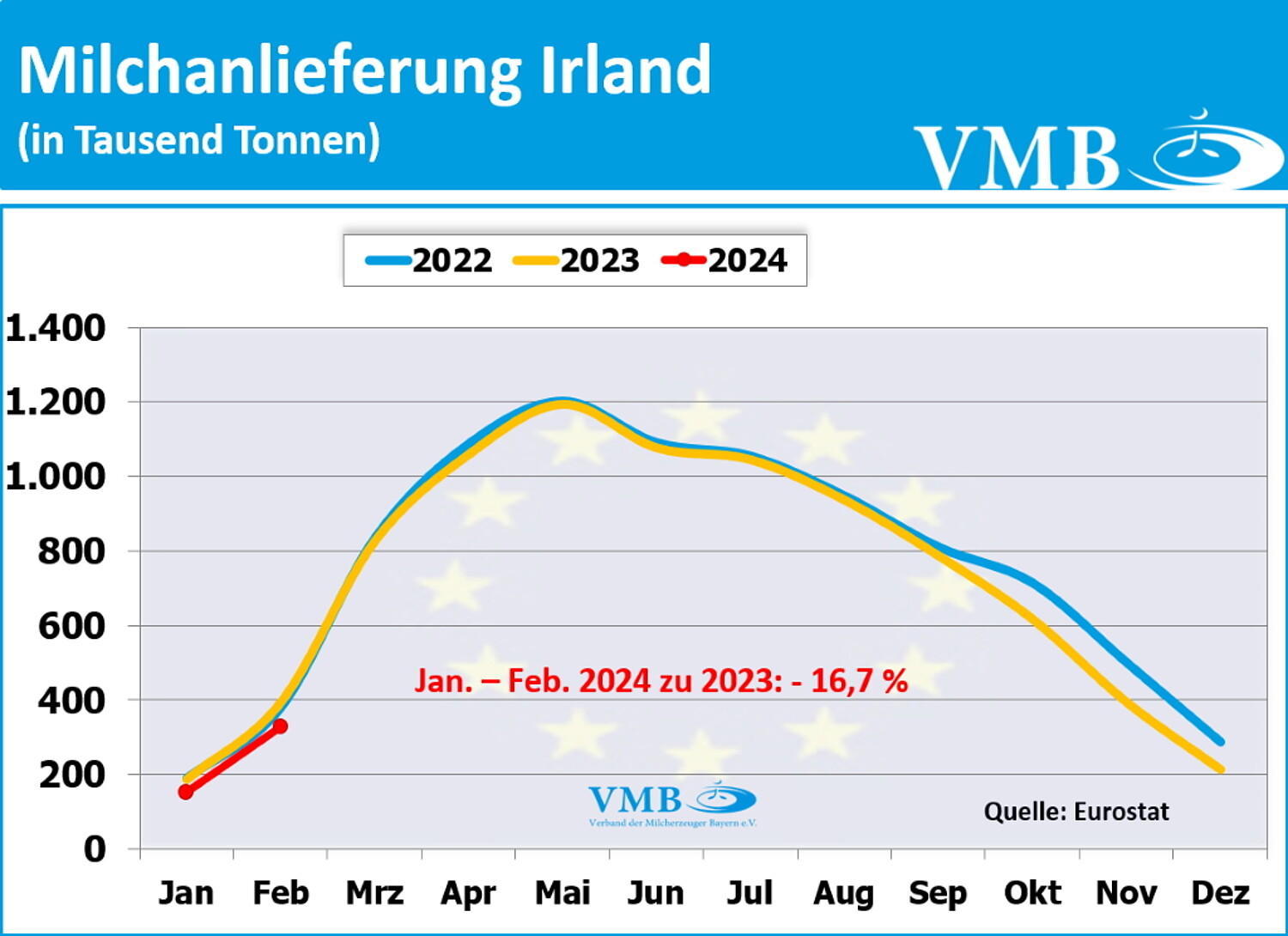 Beim Blick auf die einzelnen dominierenden Erzeugungsländer der EU, bereinigt um den Schalttag, reduzierte sich in Deutschland, Dänemark, Irland und den Niederlanden das Milchaufkommen gegenüber dem Vorjahresmonat. Relativ betrachtet war der Rückgang in Irland mit rund 16 % am deutlichsten ausgeprägt. Neben einer verzögerten saisonalen Abkalbung nehmen die Vorgaben zum Klima- und Umweltschutz immer weiter zu, was auch einen Abbau der Rinderbestände befeuert. Ähnliche Faktoren beeinflussen zunehmend auch die Milcherzeugung in den Niederlanden, die Februarwerte lagen gut 2,0 % hinter dem vergleichbaren Vorjahresergebnis zurück.