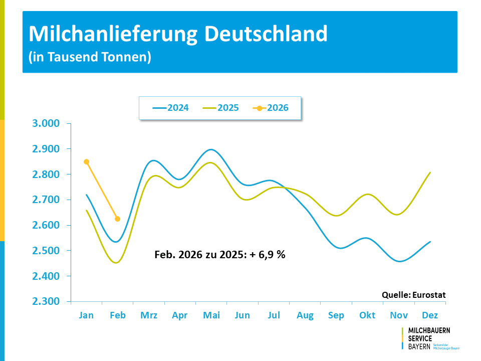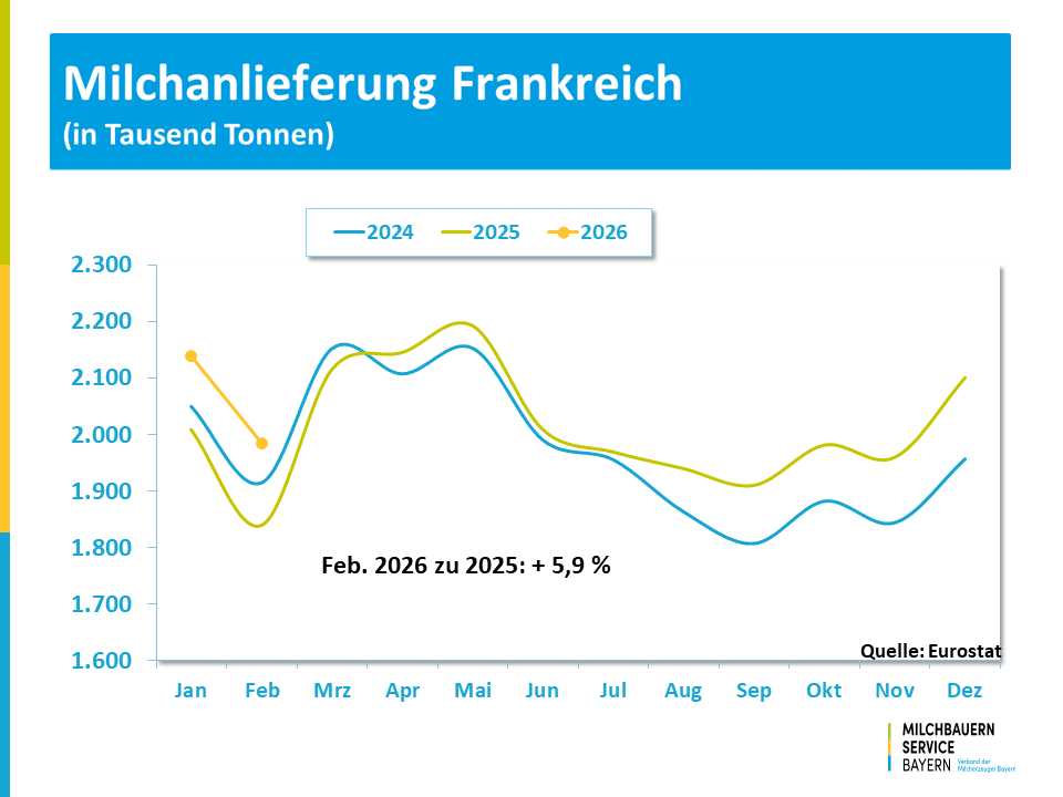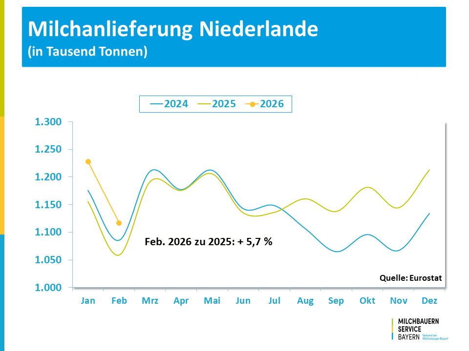 Für den bisherigen Jahresverlauf – Januar bis Februar - errechnet sich für Deutschland ein um 6,9 % höheres Aufkommen und in Frankreich liegt das Plus bei 5,9 %. In den Niederlanden bewegte sich die Milchmenge um 5,7 % über dem Vorjahreszeitraum.