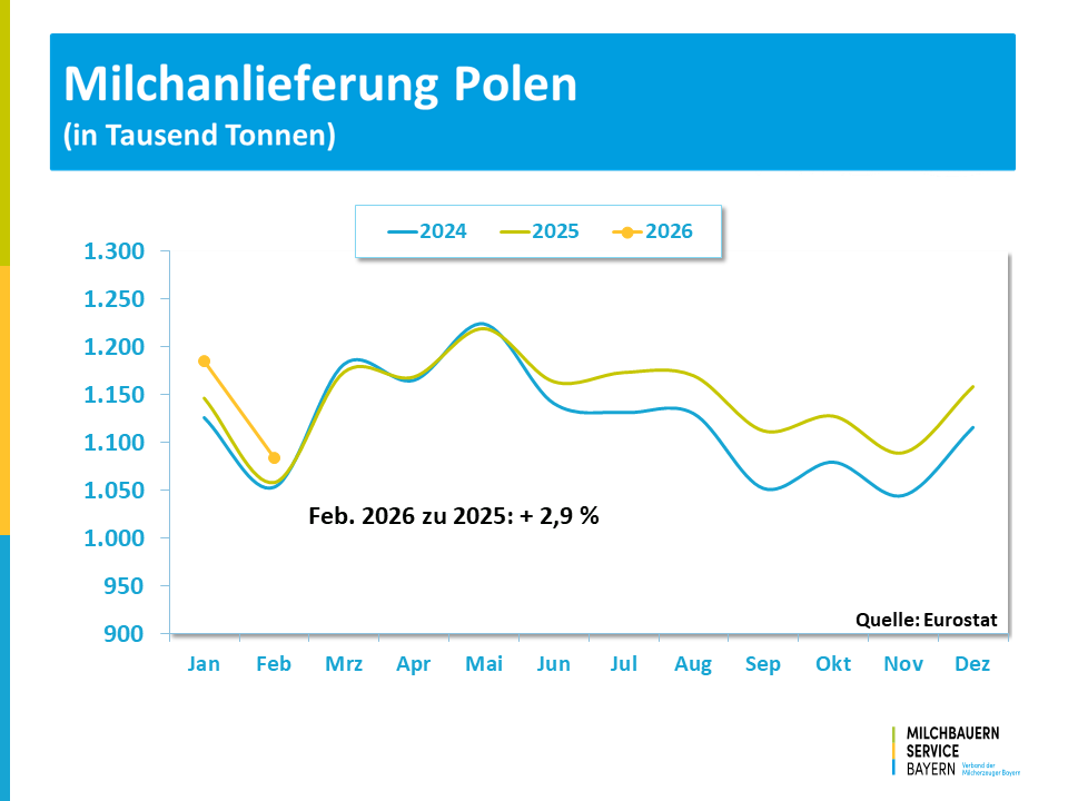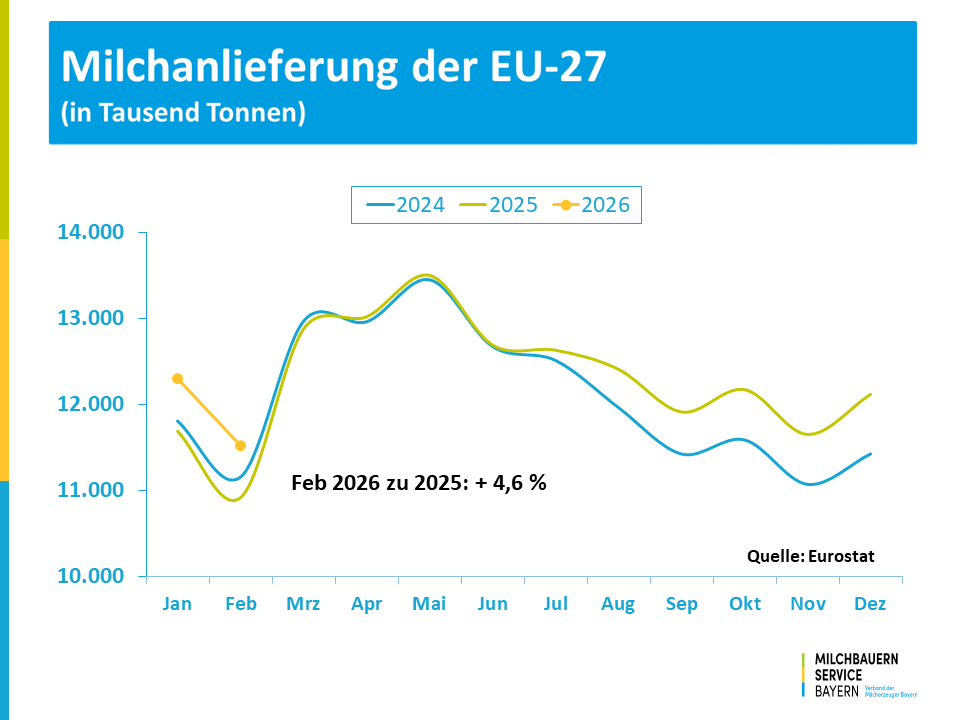 Nach einem bereits deutlich erhöhten Milchaufkommen zum Start in das Jahr 2026 hatte auch im Februar die Milcherzeugung in der EU-27 den saisonalen Anstieg auf einem spürbar höheren Niveau fortgesetzt. Die Mitgliedsstaaten erzeugten in Summe mit 11,5 Milliarden Kilogramm um 4,4 % mehr Milch als vor einem Jahr und setzten die expansive Anlieferung in den ersten beiden Monaten bei der kumulierten Betrachtung mit einem Vorsprung von 4,6 % fort.