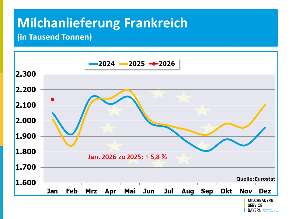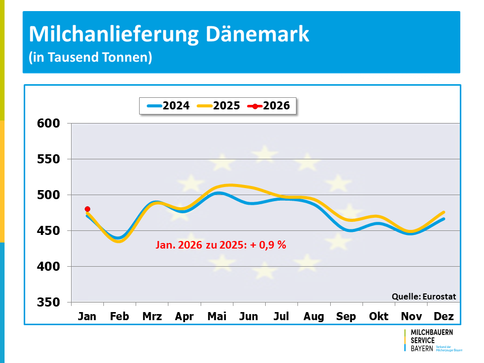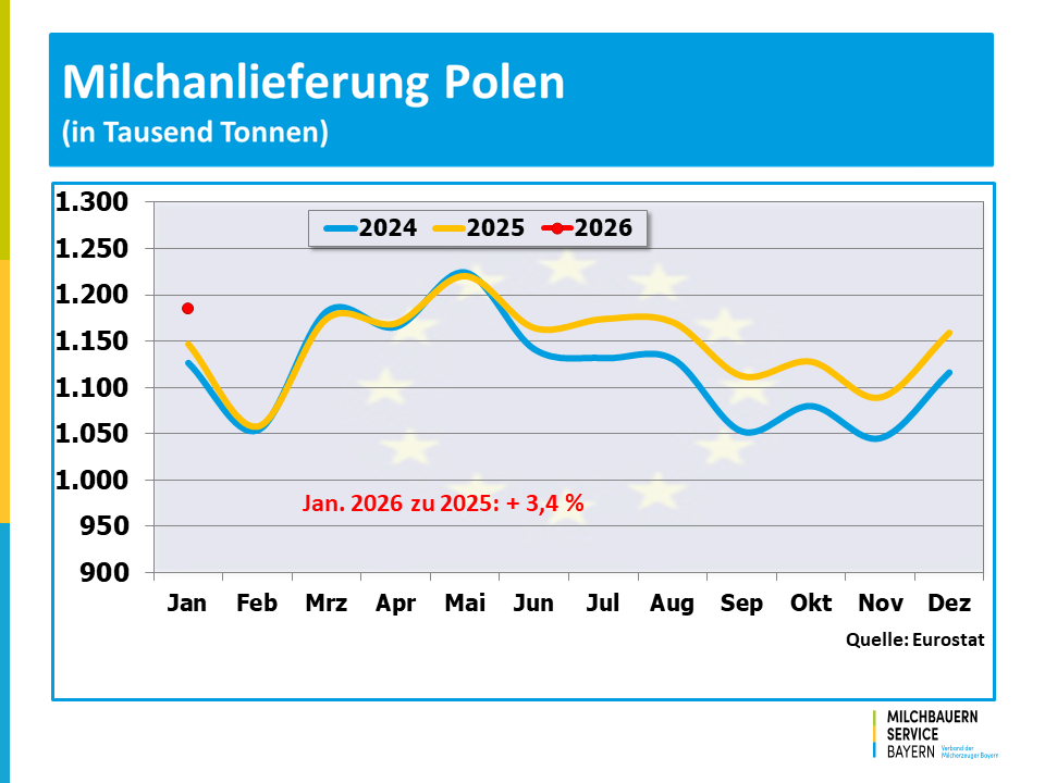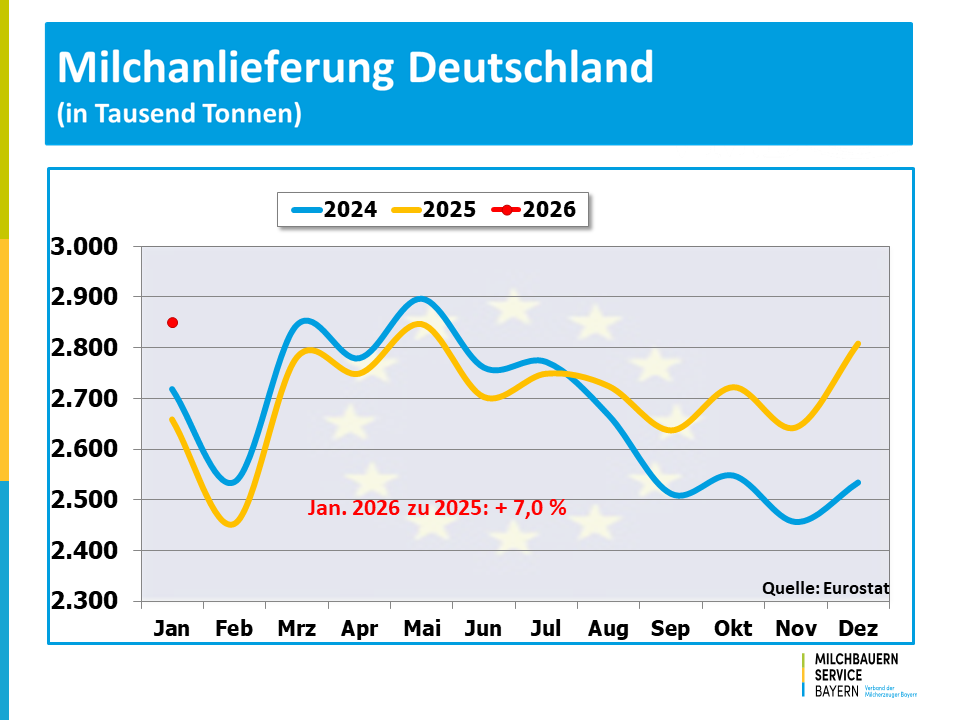 Die Milcherfassung in der EU-27 wurde auch zu Beginn des Jahres 2026 von einer expansiven Entwicklung geprägt. Das Milchaufkommen bewegte sich deutlich über den Werten der vergangenen Jahre. Insgesamt erzeugten die europäischen Milchbauern im Januar mit 12,3 Milliarden Kilogramm um 5,0 % mehr Milch als noch vor einem Jahr. Maßgebend dafür war eine deutlich höhere Milchanlieferung in den bedeutendsten Milcherzeugerstandorten der EU.