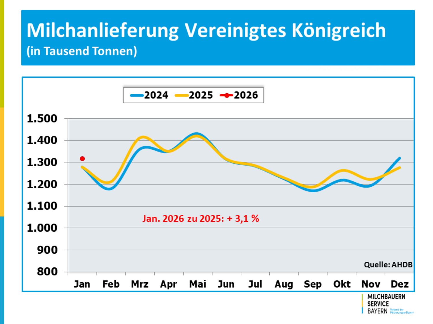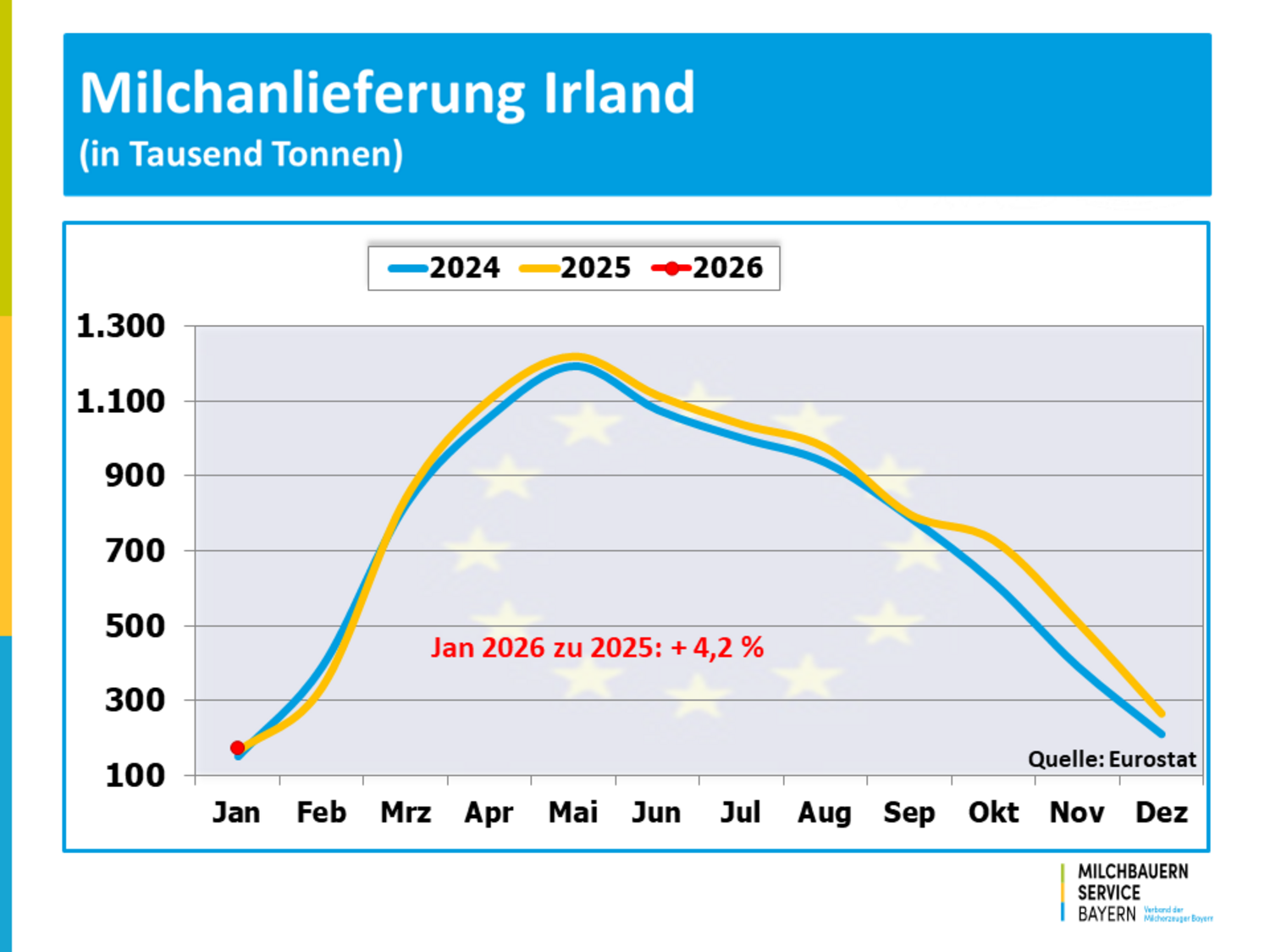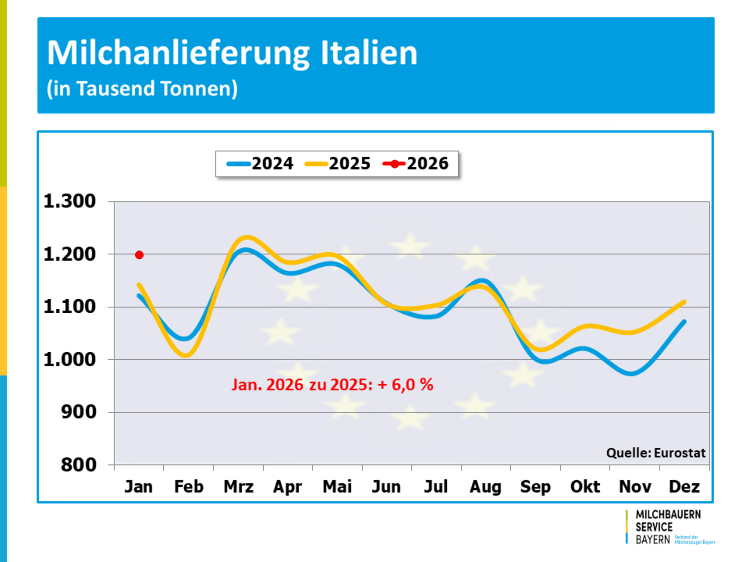 Die Milcherfassung in der EU-27 wurde auch zu Beginn des Jahres 2026 von einer expansiven Entwicklung geprägt. Das Milchaufkommen bewegte sich deutlich über den Werten der vergangenen Jahre. Insgesamt erzeugten die europäischen Milchbauern im Januar mit 12,3 Milliarden Kilogramm um 5,0 % mehr Milch als noch vor einem Jahr. Maßgebend dafür war eine deutlich höhere Milchanlieferung in den bedeutendsten Milcherzeugerstandorten der EU.