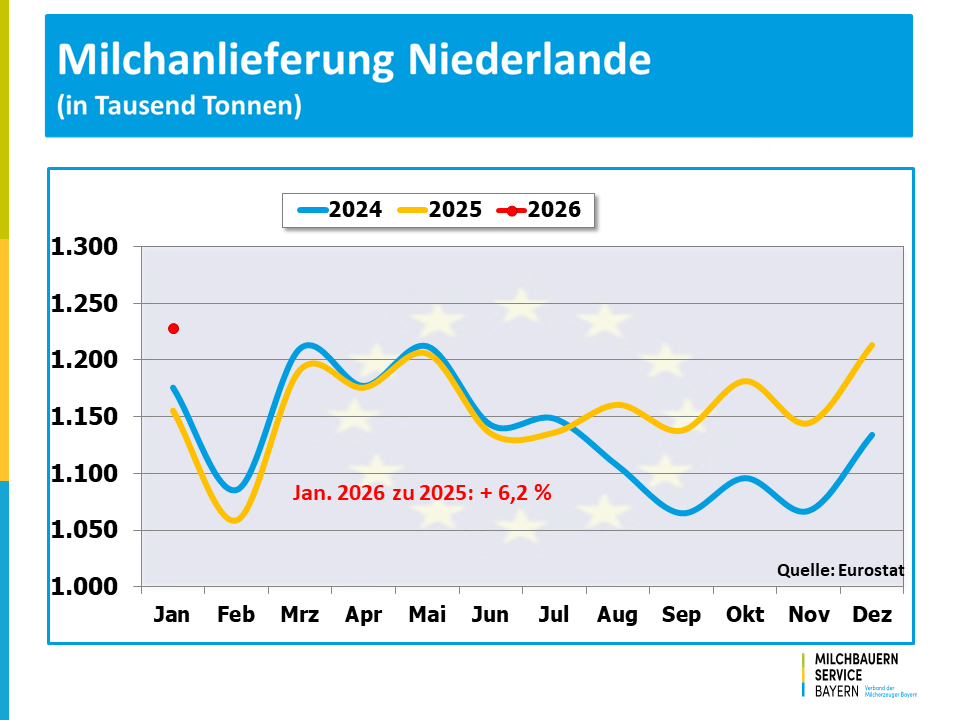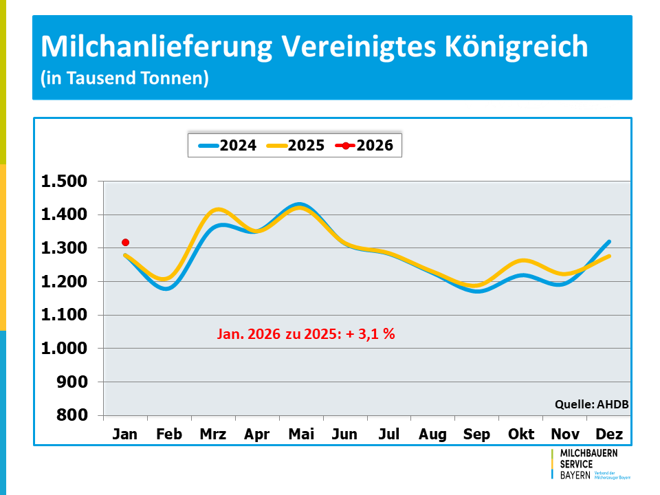 Die deutschen Milchbauern hatten im Vergleich zum Januar 2025 die Milcherzeugung um 186 Mio. kg bzw. 7 % ausgedehnt. In Frankreich erzeugten die Milchviehhalter rund 118 Mio. kg mehr Milch, was ein Plus von 5,8 % bedeutet. In den Niederlanden setzte sich die expansive Entwicklung in der Milcherzeugung fort, was angesichts der politischen Vorgaben zur Reduzierung der Tierbestände überrascht. Für Italien wurde eine um 6 % größere Milchmenge ausgewiesen und für Polen errechnet sich ein Plus von 3,4 % gegenüber dem Januar des vergangenen Jahres.