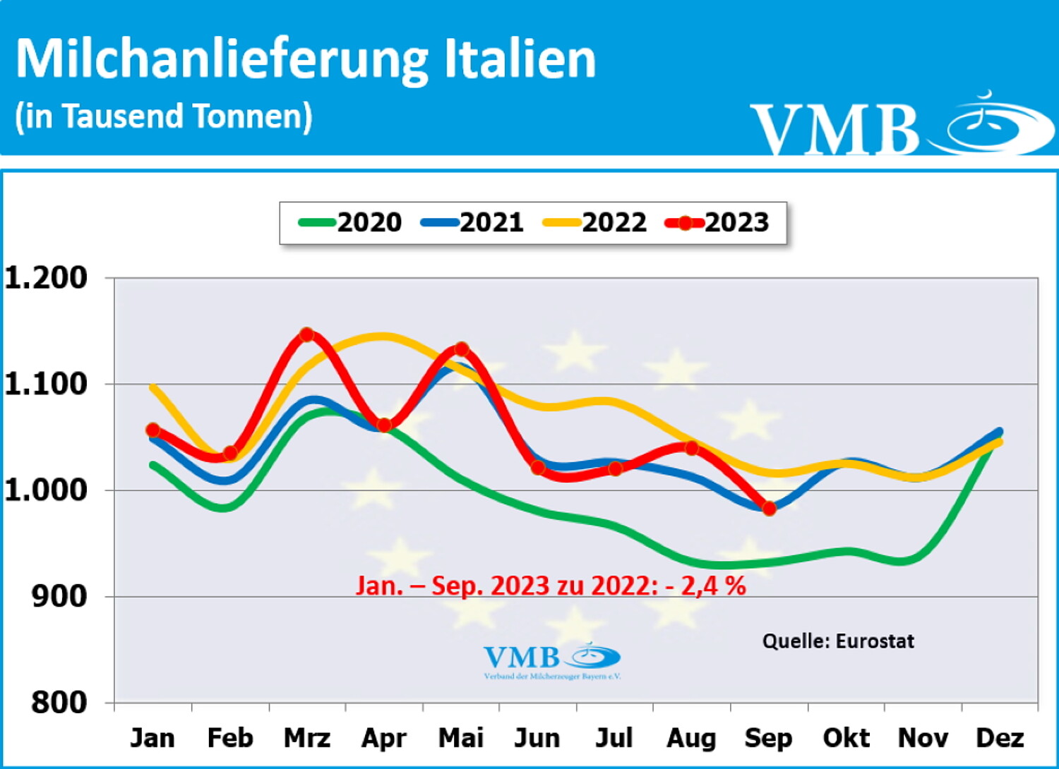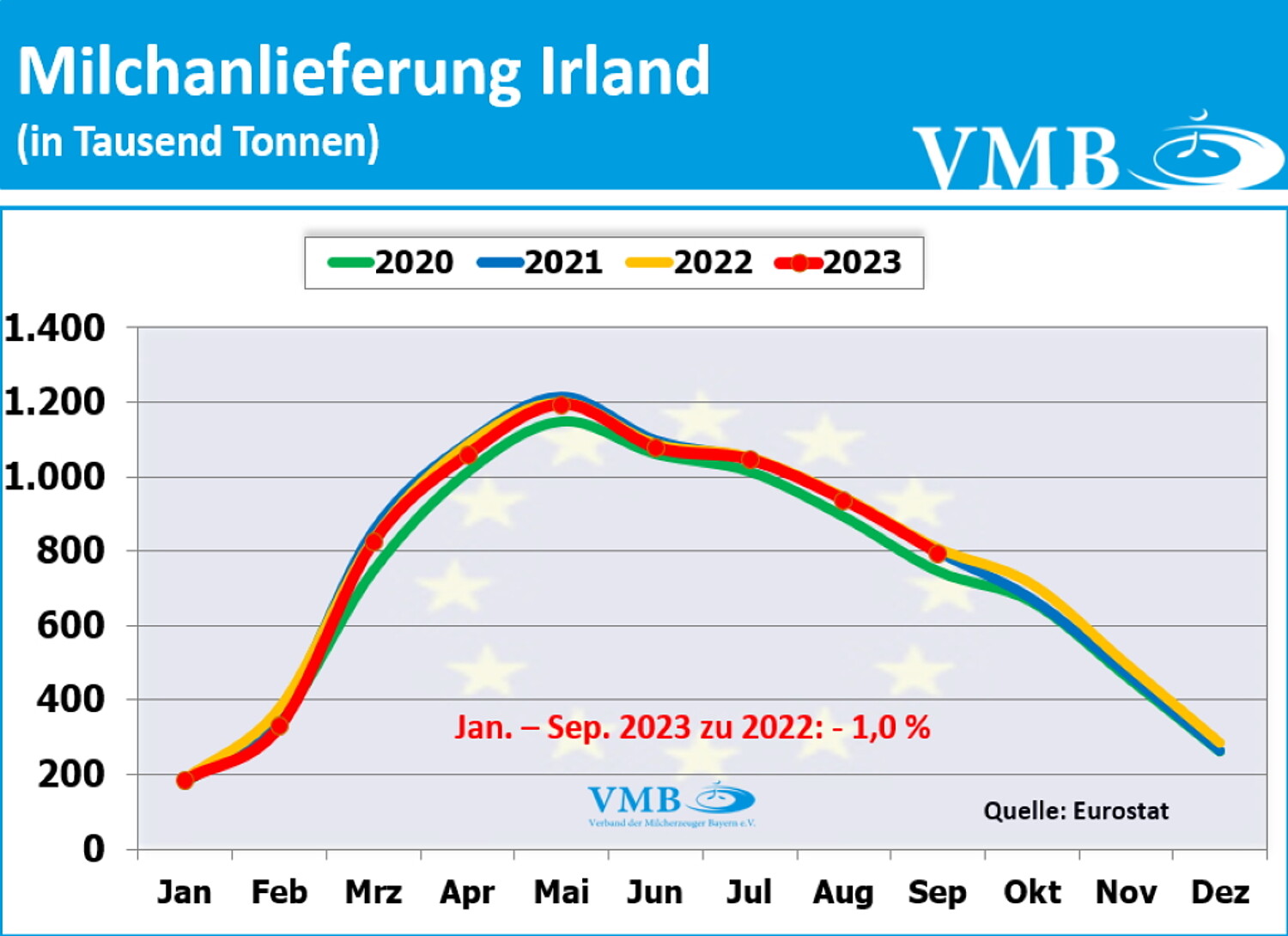 Auch erstmalig in diesem Jahr ist die Milchproduktion in den Niederlanden im Monatsvergleich geringer als von vor einem Jahr. Der Abstand ergab ein Defizit von 1,2 Prozent. Die derzeit bekannten „Unterlieferer“ (EU-Länder) wie Frankreich, aber auch seit Jahresanfang Irland und Italien, bleiben dem Trend recht treu und unterschreiten das Niveau mittlerweile auch heftiger. In Frankreich wurde ein Minus von 4,5 % für den Monat September erhoben. Aber auch in Italien und Irland findet sich eine größere Differenz vor. Die Erhebungen zeigen einen Wert von 3,3 bzw. 1,9 Prozent auf. In Summe unterschreitet Frankreich seine Produktion bereits um 2,2 Prozent und in Italien und Irland um 2,4 und um 1,0 Prozent. Die EU-Milchanlieferung wird nach ersten Einschätzungen auch im letzten Jahresquartal 2023 weiter „unterliefert“ bleiben. Dennoch wird das Gesamtvolumen der europäischen EU-Staaten zum Vorjahr erhöht ausfallen, allerdings wird sich die Überschreitung bei vielleicht nur noch einem knappen halben Prozent einpendeln.
