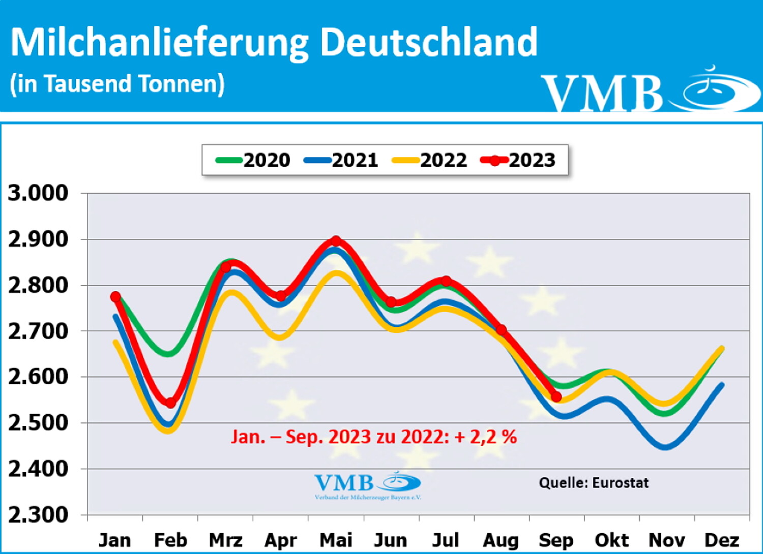 Das europäische Milchanlieferungsniveau hat im September 2023, erstmals im jahreszeitlichen Rückgang, ein deutliches Minus eingenommen. Im aktuellen Berechnungsmonat erreichte die Höhe der Milcherzeugung einen Betrag von 11,443 Milliarden Kilogramm und somit ein Minus von 0,9 Prozent. Somit ist für den Herbst gewissermaßen ein Minustrend für die kommenden Monate eingeleitet worden. Dennoch bleibt die vorläufige Gesamterzeugung nach drei Jahresquartalen höher als noch zum Vorjahreszeitraum. Nach einem dreiviertel Jahr summiert sich ein Volumen von 110,882 Milliarden Kilogramm Milch bzw. ein Plus von 0,6 Prozent bzw. eine erweiterte Anlieferung von 675 Millionen Kilogramm Milch.