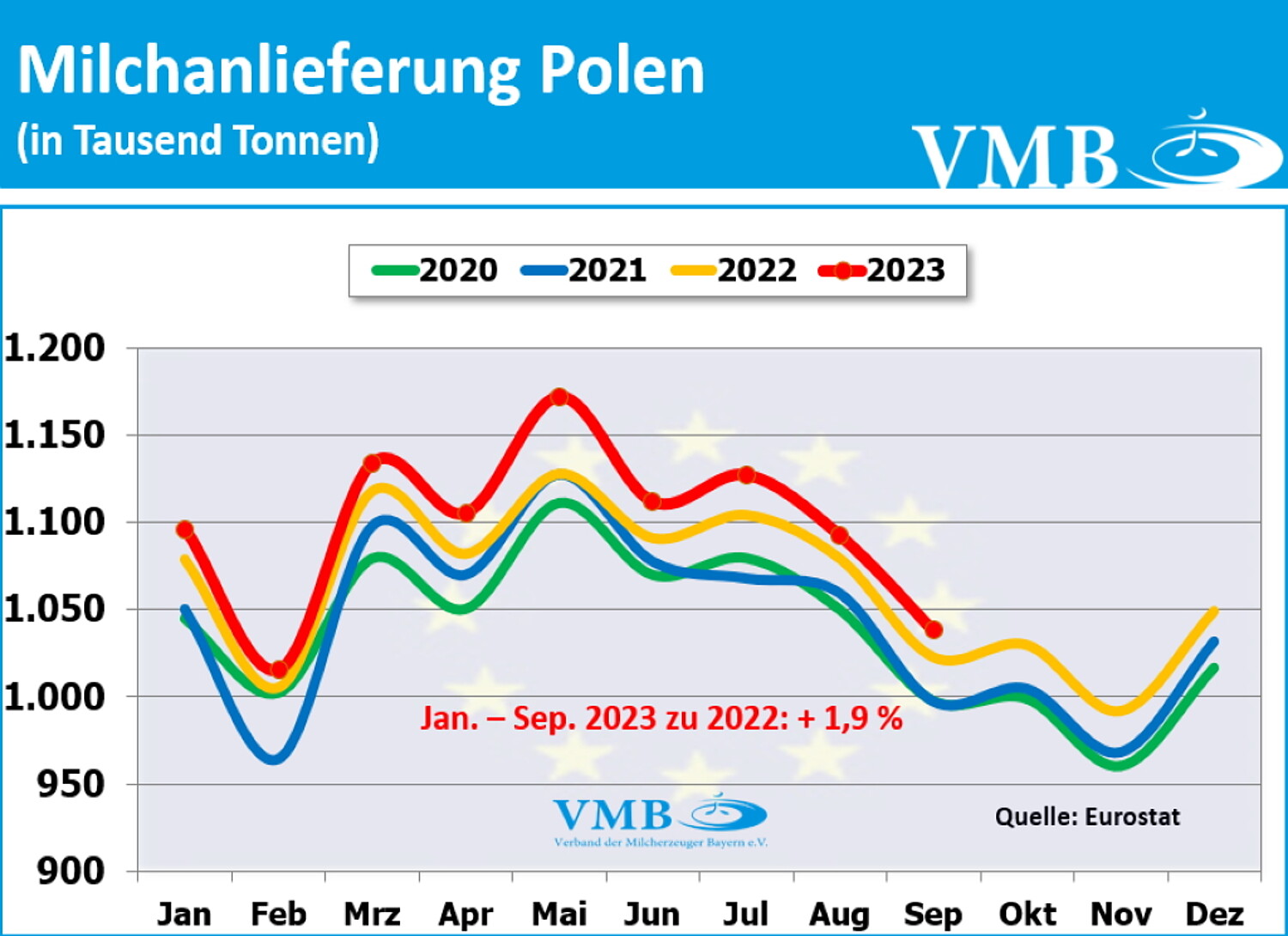 Nur noch Polen dominiert die Rangliste im September 2023 als sogenannter Überlieferer bzw. als Milcherzeugerland, welches die Vorjahresmilchmenge übertrifft. In Polen stieg die Monatsmilchmenge wieder um eineinhalb Prozent an, so dass die kumulierte Erzeugung bei knapp 10 Milliarden Kilogramm liegt; dies entspricht nach neun Kalendermonaten einem Plus von 1,9 Prozent. In allen anderen wichtigen Milcherzeugerländern ging die Milchanlieferung zum Vorjahresmonat deutlich oder auf das identische Vorjahresmonatsniveau zurück. In Deutschland und Dänemark meldet die amtliche Statistik noch einen kleinen Vorsprung von 0,2 bzw. von 0,4 Prozent. Damit befindet sich die aufsummierte Milcherzeugung in Deutschland bei 24,569 Milliarden Kilogramm Milch mit plus 2,2 Prozent und in Dänemark bei 4,318 Milliarden Kilogramm Milch mit einem Plus von 1,2 Prozent.