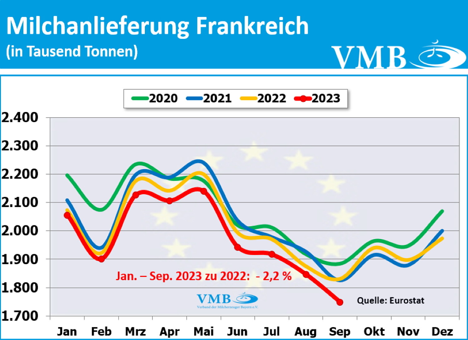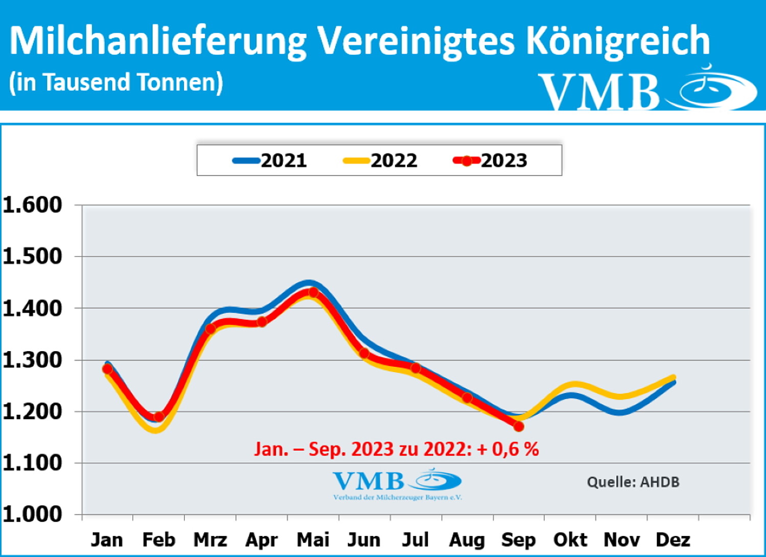 Vom Amt für Statistik der Europäischen Union wurden die Milcherzeugungsmengen der 27 EU-Staaten veröffentlicht. Das Vereinigte Königreich (United Kingdom) wird in der Auswertung extra aufgeführt. Die Daten werden bei Agriculture and Horticulture Development Board (AHDB) publiziert.