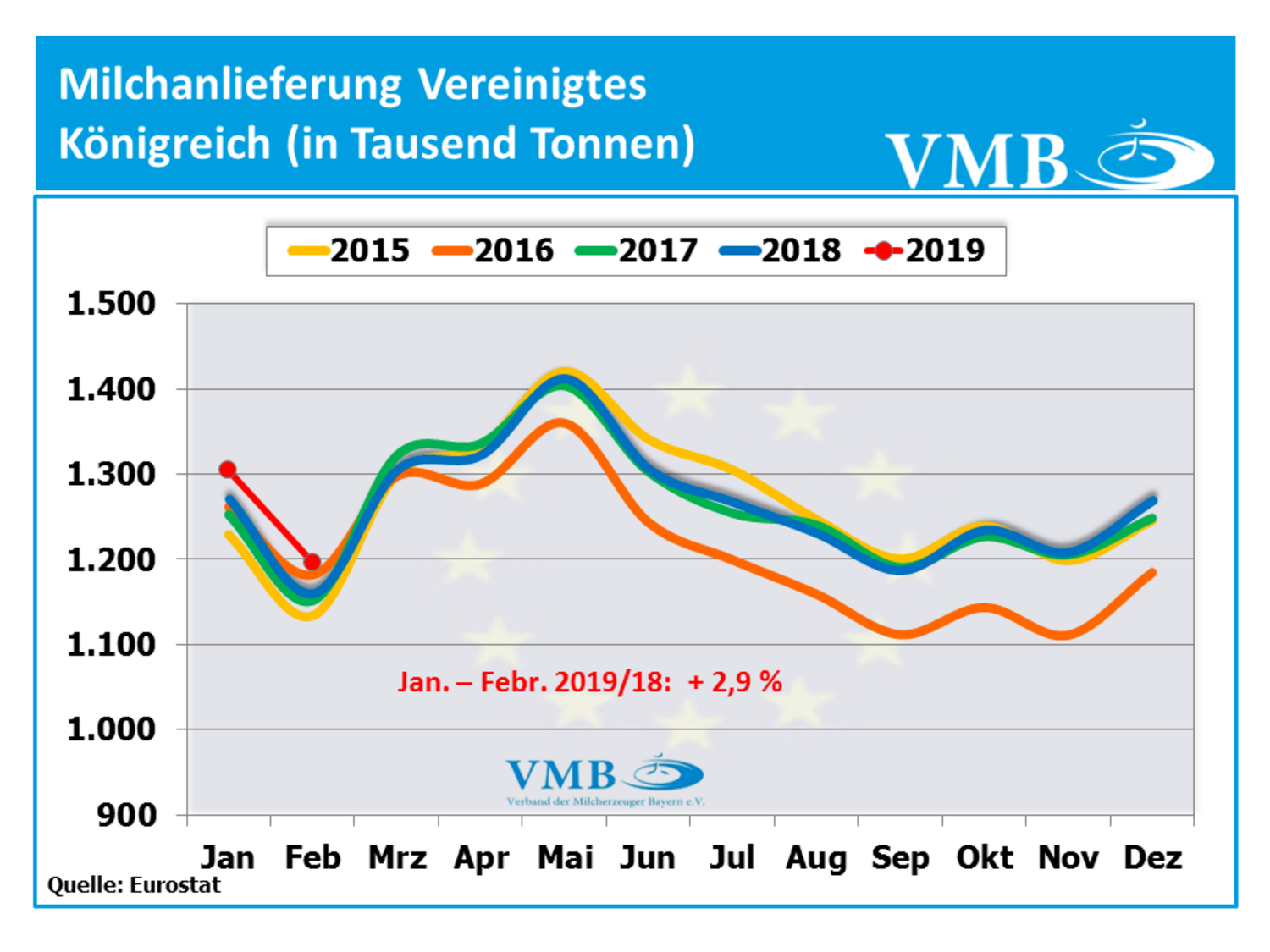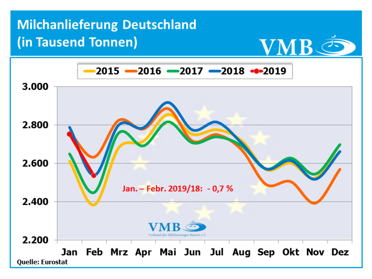 Der rückläufige Trend der europäischen Milchanlieferungen Anfang des Jahres 2019 ist nicht unerwartet entstanden. Bereits in den letzten Monaten des zurückliegenden Jahres gingen die Milchanlieferungen in einigen wichtigen EU-Milcherzeugungsländern zum Teil sehr deutlich zurück. Vermutlich haben die Auswirkungen der Trockenheit im vergangenen Jahr aber auch die produktionstechnischen Vorgaben im Ackerbaubereich zu einer Verringerung der Milchleistung in einigen Ländern geführt.