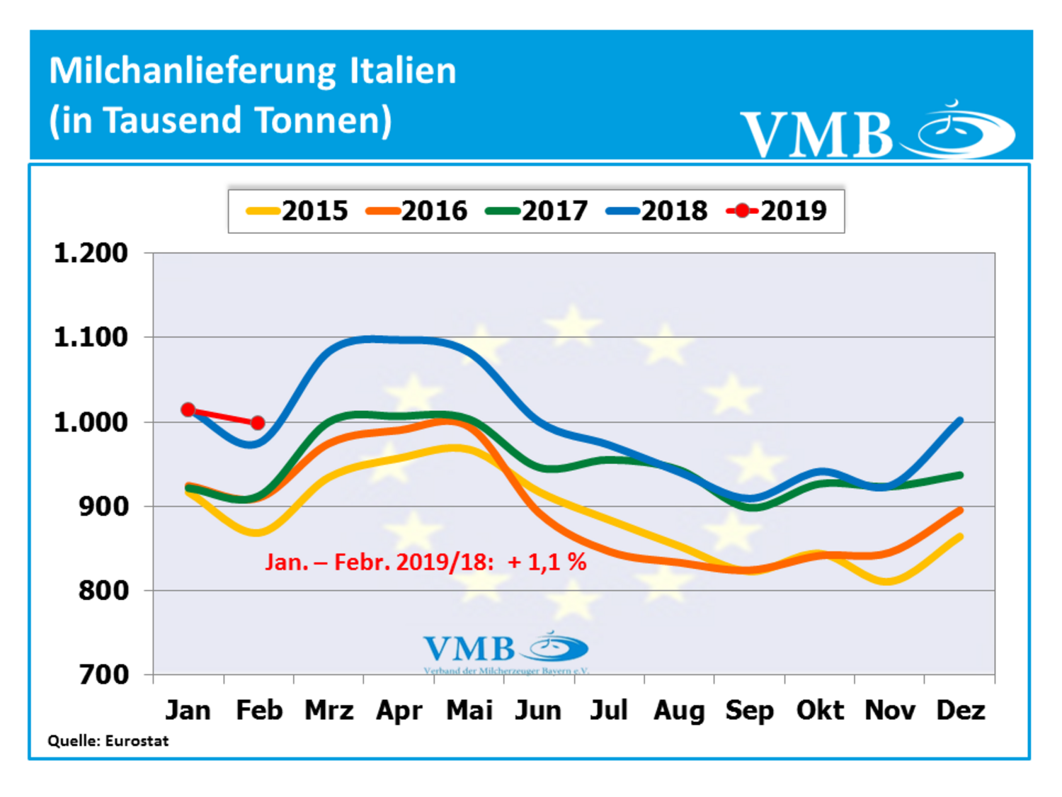 Wie bereits schon in den vergangenen Jahren erhöhte sich dagegen das Milchaufkommen, mit stetig wachsenden Trend zu den vergleichbaren Vorjahren, in Polen, Italien, Dänemark und vor allem in Irland.