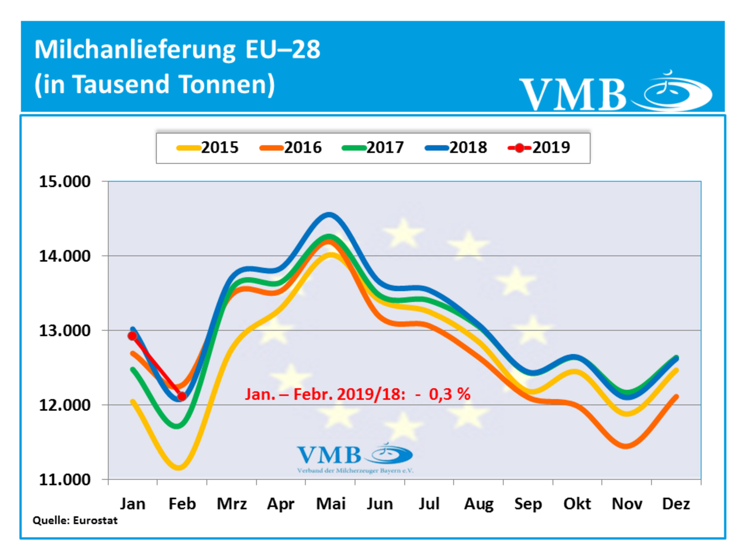 Nach den Auswertungen des statistischen Amtes der Europäischen Union, kurz Eurostat genannt, liegt die aktuelle Erzeugungsmenge der EU-28-Mitgliedstaaten für die ersten beiden Monate 2019 leicht unter dem Vorjahr. Laut der Statistik beläuft sich die Gesamtmenge auf 25,031 Milliarden Kilogramm Milch und unterschreitet damit um 0,3 Prozent das Milchaufkommen des Jahr 2018.