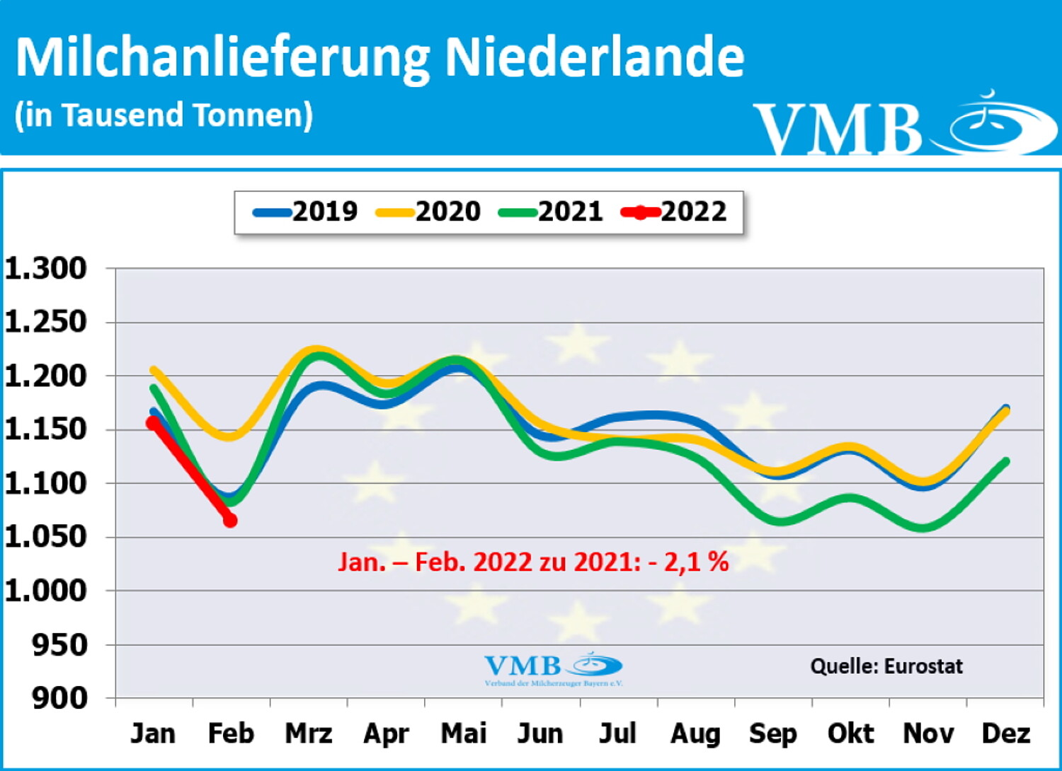 Laut der vorläufigen Auswertung von EUROSTAT bleibt das Anlieferungsverhalten in der EU mit seinen Mitgliedstaaten analog zu 2021. Das Aufkommen an Milch nimmt weiter in den stärksten Milchproduktionsländern wie Deutschland, Niederlande und in etwas abgeschwächter Form auch in Frankreich ab. Die Abstände im Februar 2022 weisen Prozentsätze zwischen Minus 1,5 und 0,1 Prozent auf. Etwas höher fiel diesmal die Milcherzeugung in Dänemark mit einem Prozent aus. Irland, Polen und Italien bleiben weiterhin in ansprechenden Steigerungen gegenüber dem Vorjahresmonat zwischen über sieben bis zwei Prozent. Kumulativ hat sich somit eine kleine Anhebung zum Vorjahr ergeben. Für die ersten beiden Kalendermonate liegt das europäische Milchaufkommen mit 22,739 Milliarden Kilogramm Milch um 0,1 Prozent höher als im vorangegangenen Jahr. Tendenziell wird das Wachstum der europäischen Milchproduktion aber in den kommenden Monaten durch die politischen Konfrontationen in Osteuropa, eher durch die ansteigenden Kosten bei der Milchproduktion, vor allem bei Futtermittel und Energie, schwinden.