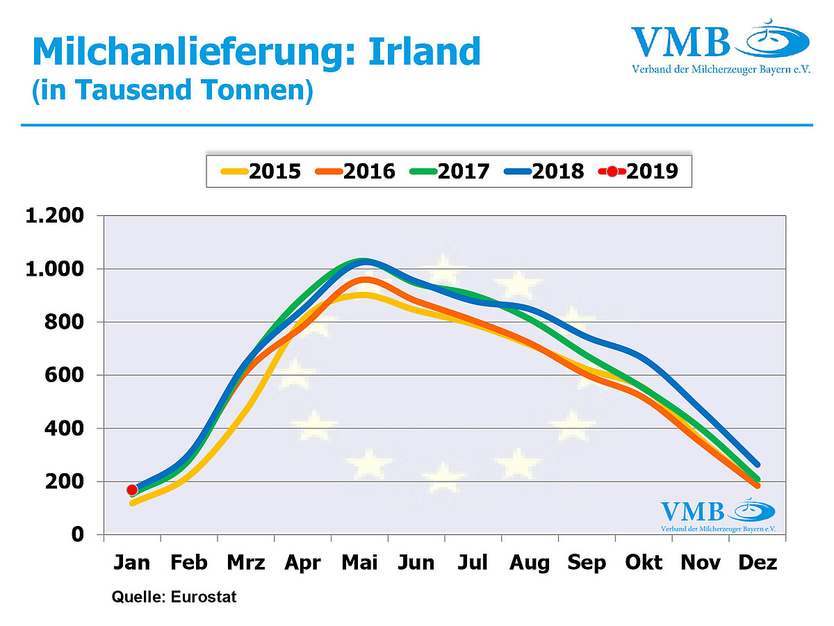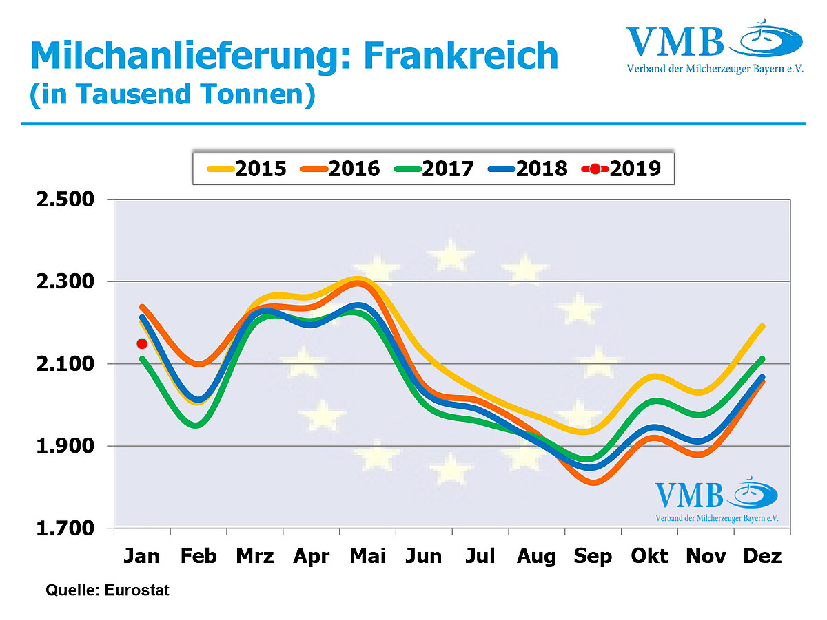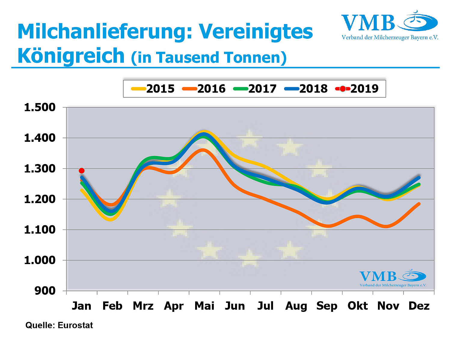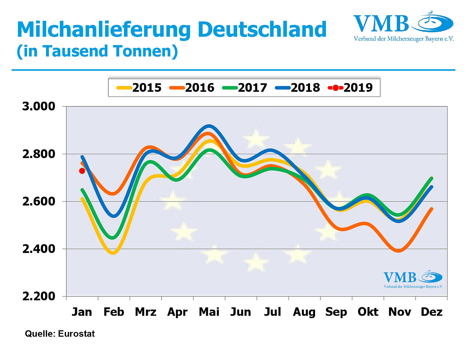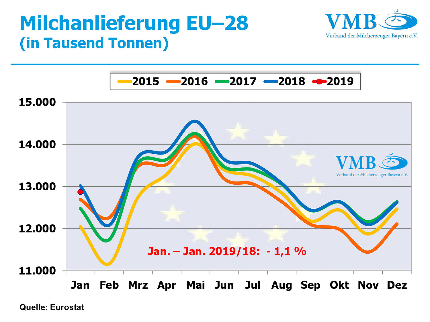 Nach den Auswertungen des statistischen Amtes der Europäischen Union, kurz Eurostat genannt, liegt die aktuelle Erzeugungsmenge der EU-28-Mitgliedstaaten für den Monat Januar 2019 leicht unter den Vorjahreswerten. Laut der Statistik beläuft sich die Gesamtmenge auf knapp 12,9 Milliarden Kilogramm Milch und liegt damit mit 1,1 Prozent geringfügig unter den Zahlen des Vorjahres.