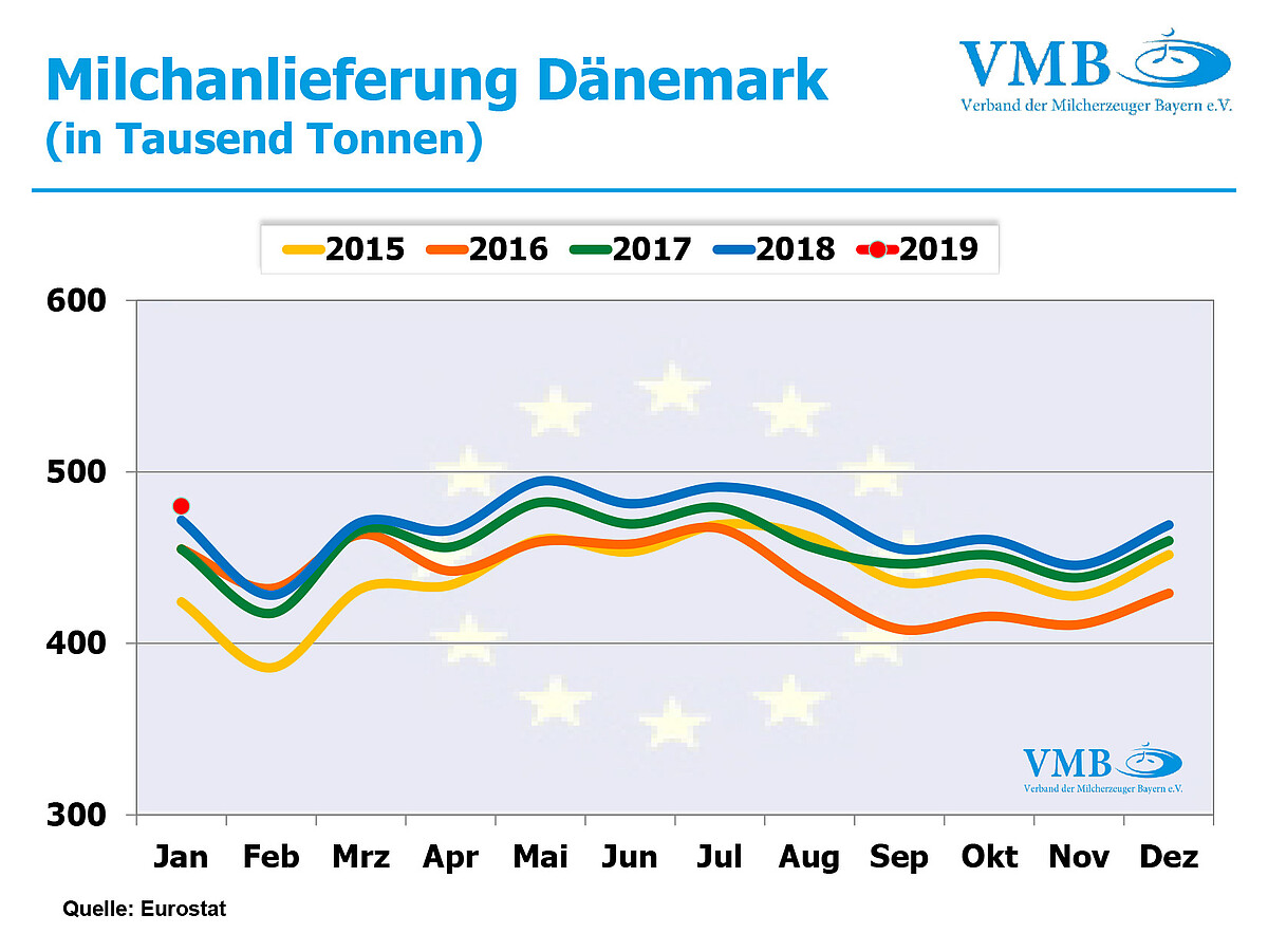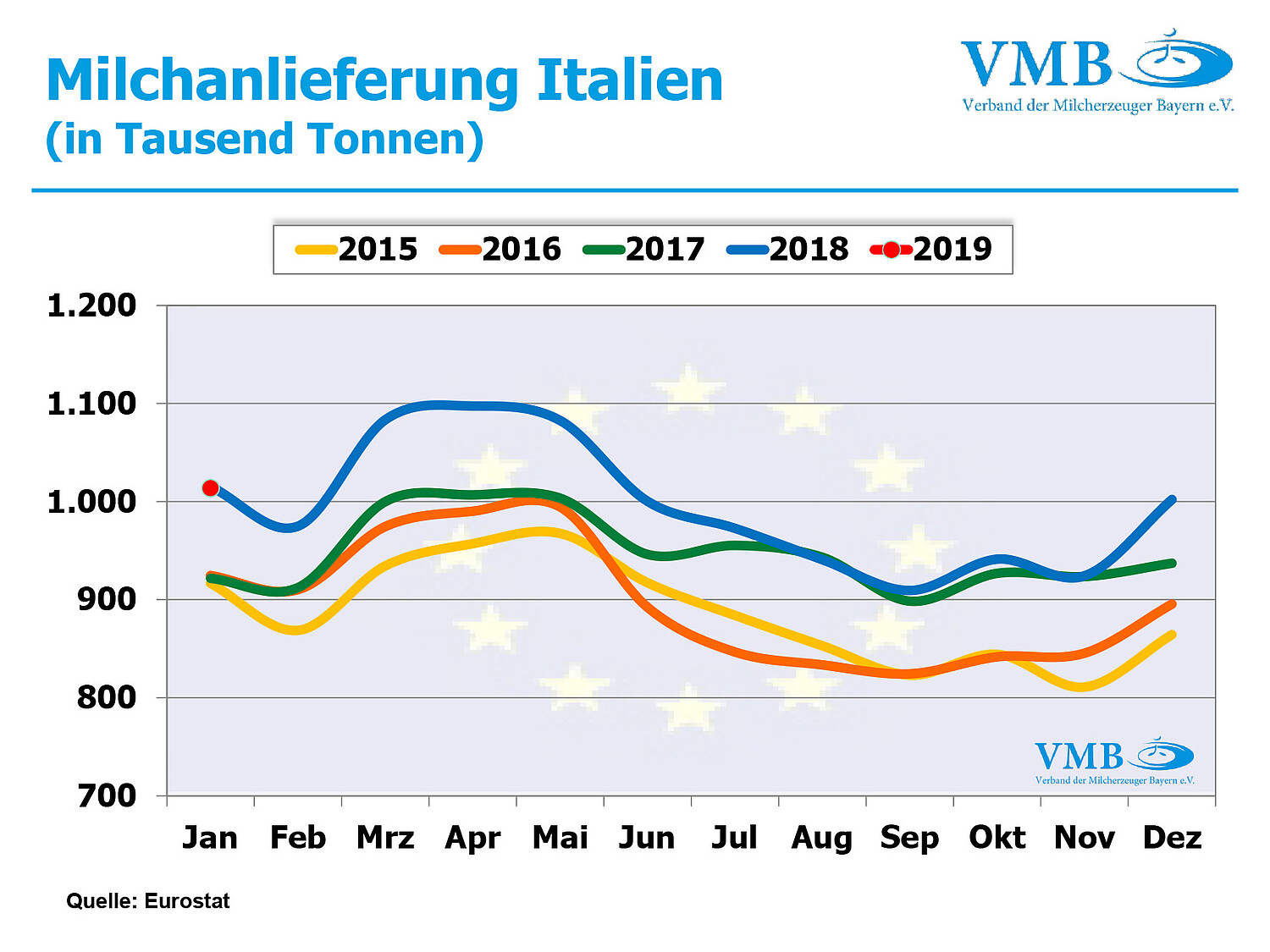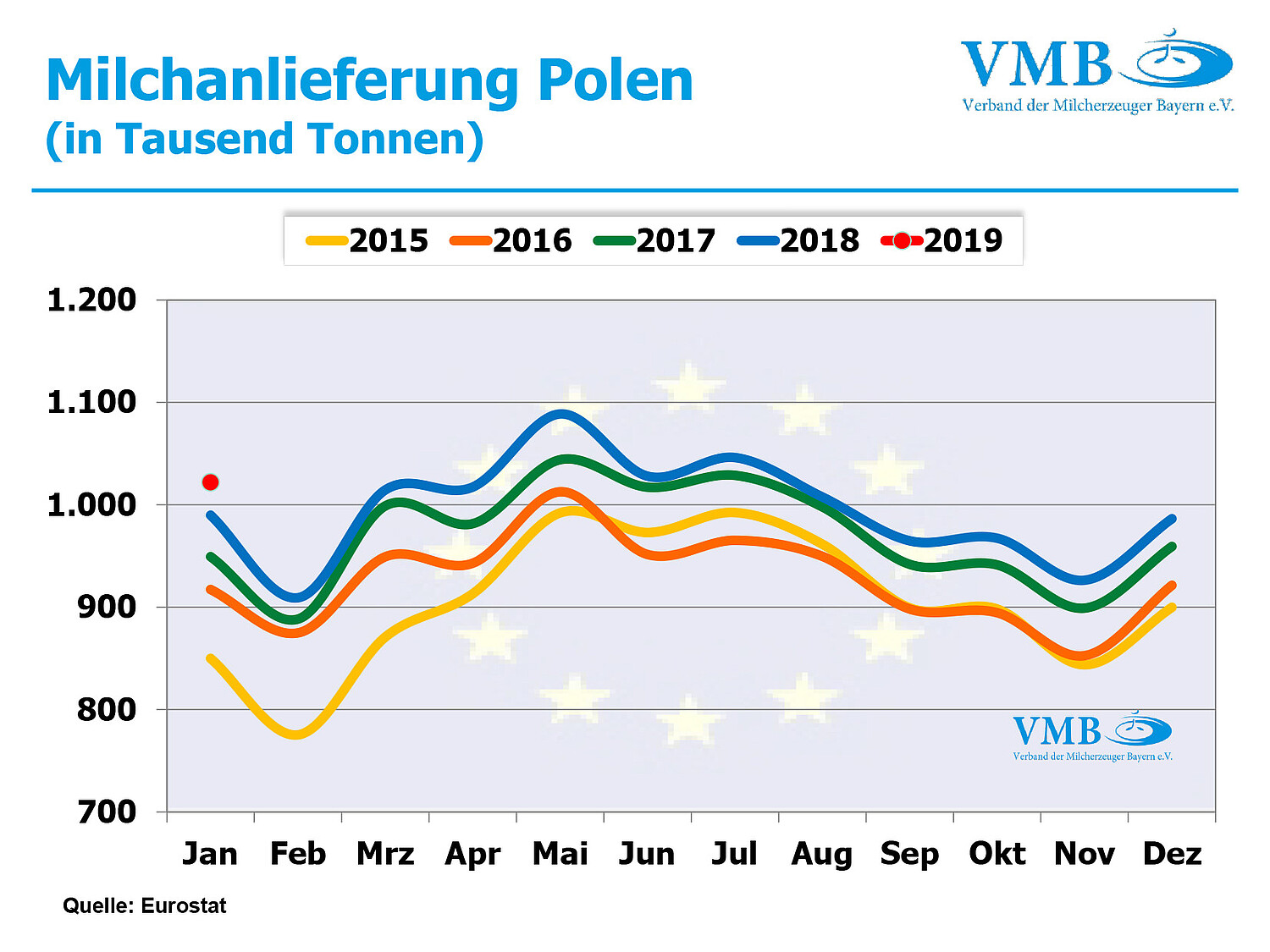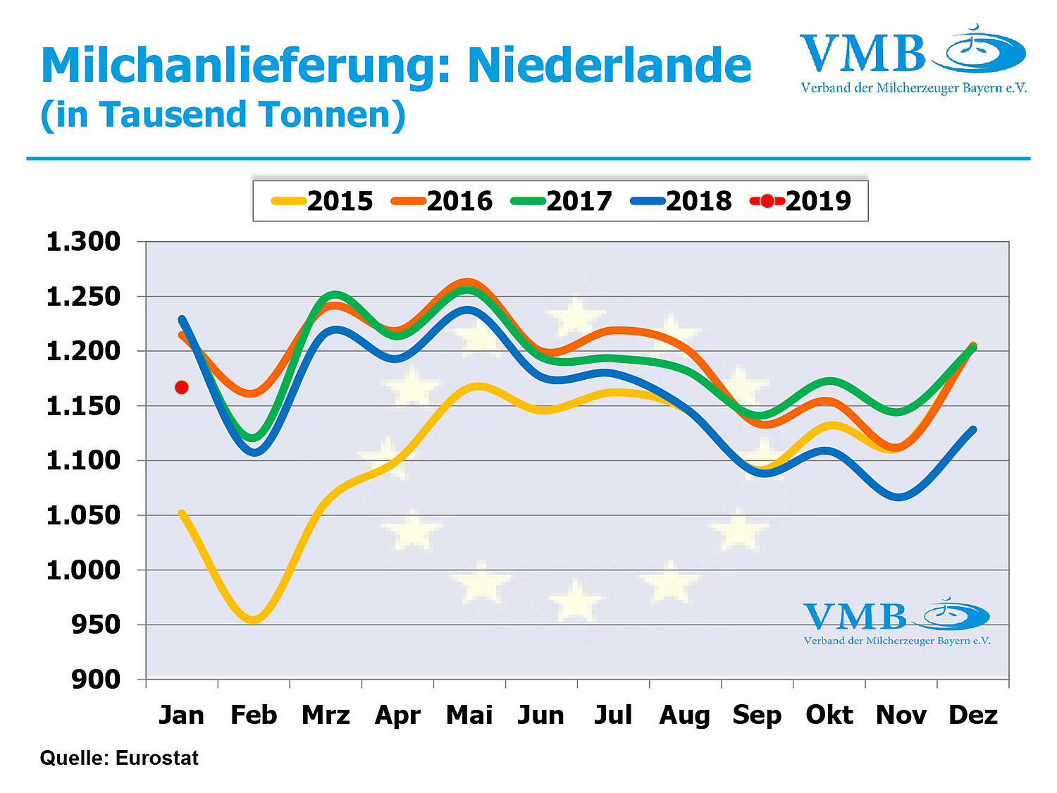 In der differenzierten Betrachtung der Milchanlieferungen der einzelnen EU-Staaten, ergeben sich, wie auch in den zurückliegenden Jahren, unterschiedliche Entwicklungstendenzen. Während einige Länder, wie Polen (+3,2%), Dänemark (+1,7%), Großbritannien (+1,7%) oder auch Irland (+0,6%), ihre Erzeugung teils auch stärker weiter ausdehnen, verfügen die Milchanlieferungen anderer EU-Staaten über eine eher rückläufige Tendenz. Im Monat Januar liegt der Abstand der Milchmengen von Italien (-0,2%), Deutschland (-2,1%) und Frankreich (-2,9%) aber vor allem von den Niederlanden(-5,1%), etwas deutlicher unter den Werten des vergleichbaren Vorjahresmonats. Vermutlich wird sich das Erzeugungsniveau 2019 weitgehend zwischen den Anlieferungszahlen von 2018, 2016 und 2015 etablieren.