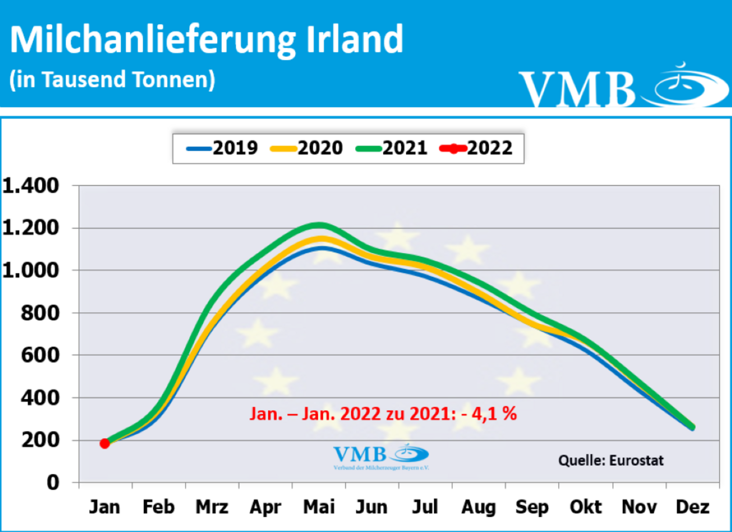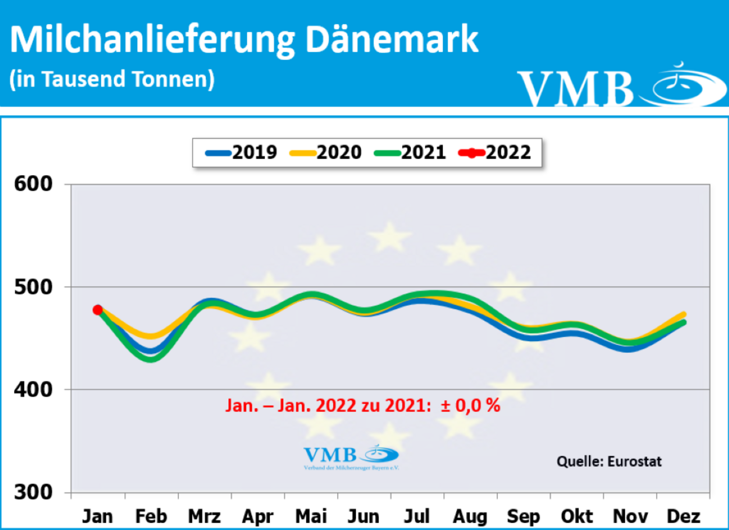 Mitte letzten Jahres hat die Milcherzeugung in der europäischen Union neben dem saisonalen Rückgang auch im Monatsvergleich nachgelassen. Am Jahresende 2021 kam die Milchproduktion ans Vorjahresniveau 2020 heran. Mit den aktuellen Anlieferungen 2022 wird zum Jahresstart die Milchproduktion im Vergleich zum Vorjahr unterschritten. Nur noch wenige Länder in der EU weisen in der Statistik eine höhere Milchanlieferung zum Vorjahr auf: Die größten Milcherzeugerregionen wie Deutschland, Frankreich und den Niederlanden bleiben weiterhin Unterlieferer. Selbst Irland zeigt derzeit ein Minus von 4,1 Prozent auf, wobei die Milcherzeugung erst saisonal langsam startet. In Dänemark liegt das Erzeugungsniveau gleich. Nur in den bekannten Überliefererstaaten Polen und Italien hat sich die Entwicklung wie zum Vorjahr 2021 bestätigt. Diese beiden Länder starten mit einem Plus von 2,7 bzw. 1,3 Prozent.