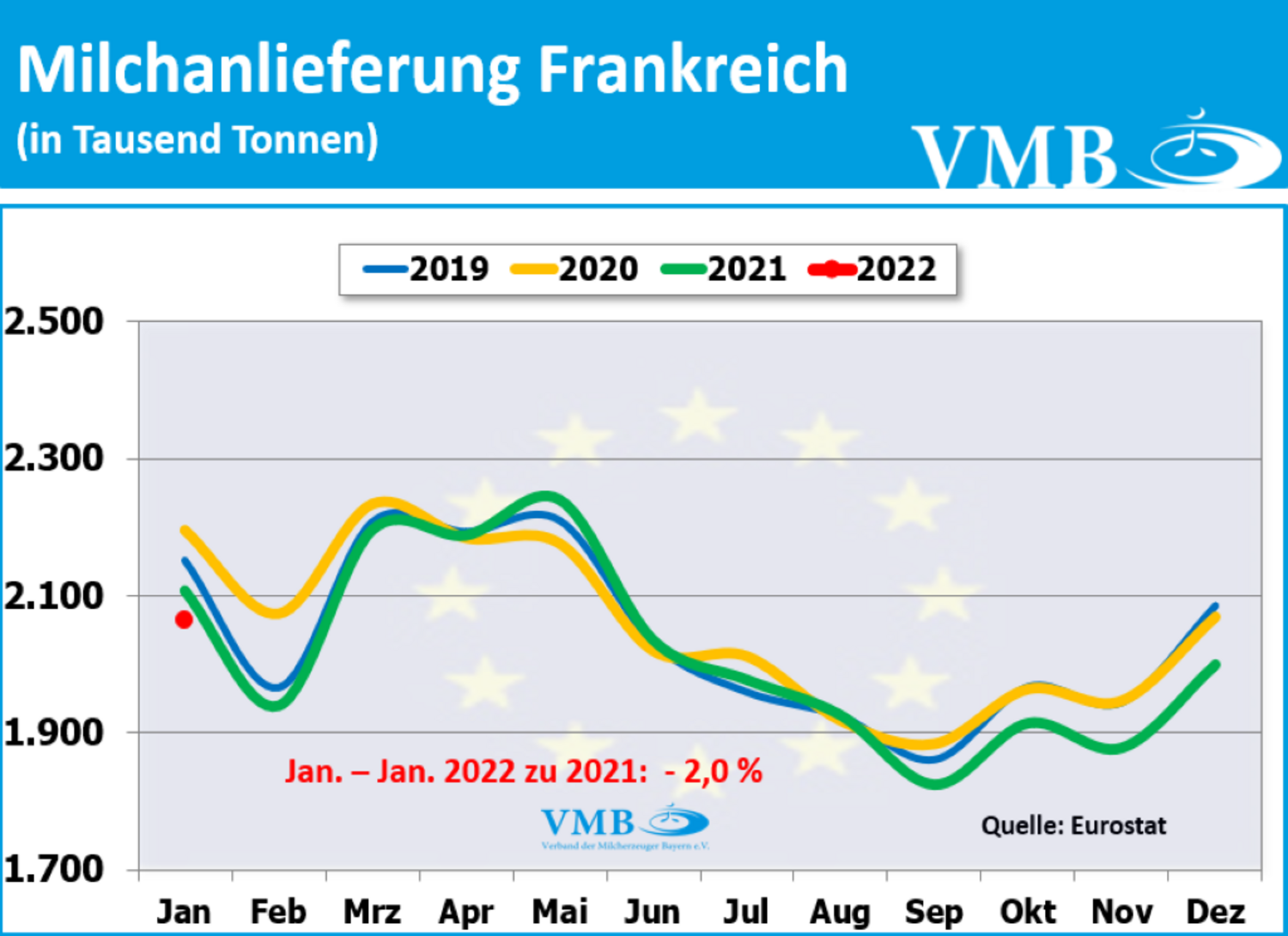 Die Milchproduktion in der Europäischen Union (EU) zeigt nach dem aktuell veröffentlichten Bericht der Eurostat für den Januar 2022 eine weitere Unterlieferung und setzt somit den Trend des vergangenen zweiten Halbjahres 2021 fort. Mit 11,677 Milliarden Kilogramm Milch weist die prozentuale Veränderung zum Januar 2021 ein Minus von 0,3 Prozent auf. Demnach reduzierte sich die Milchmenge um rund 36 Millionen Kilogramm.