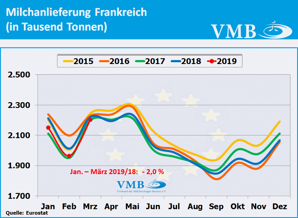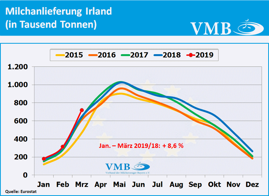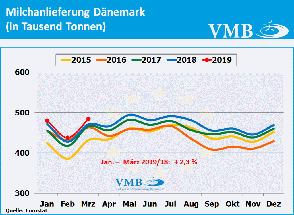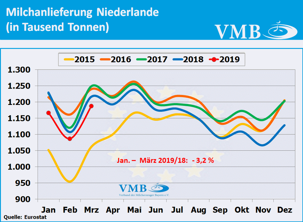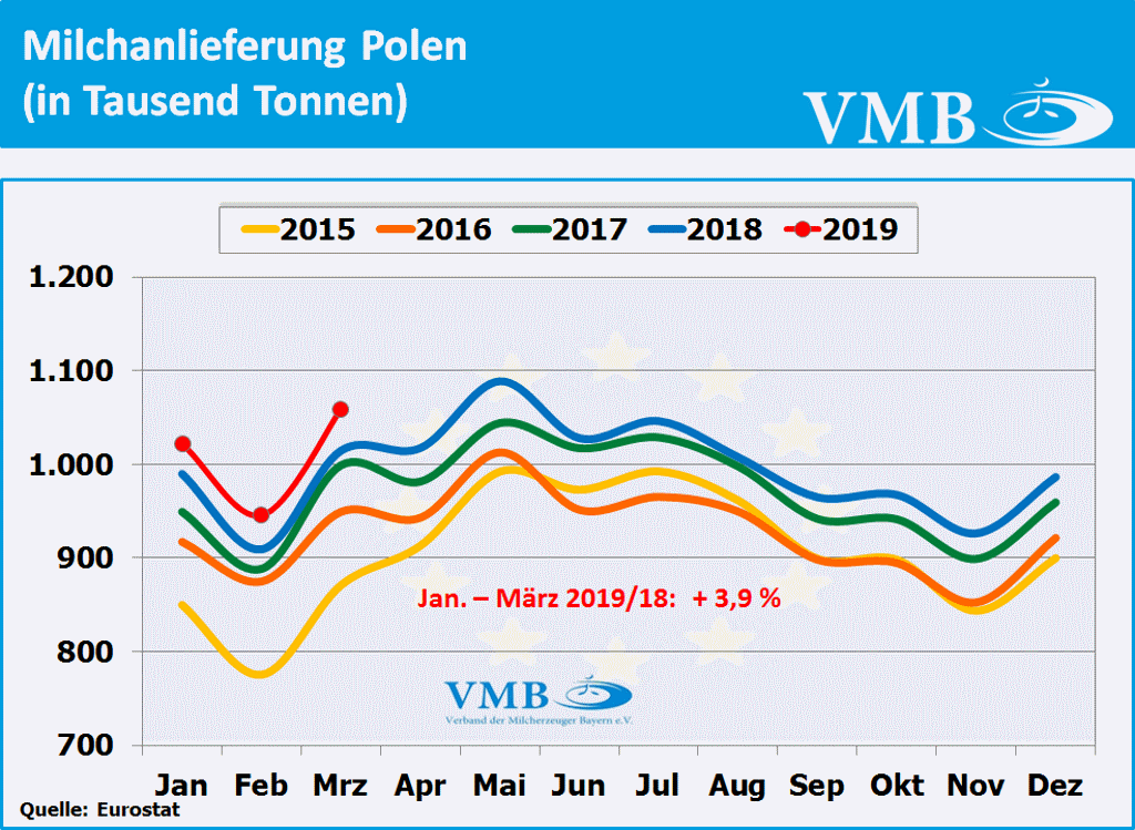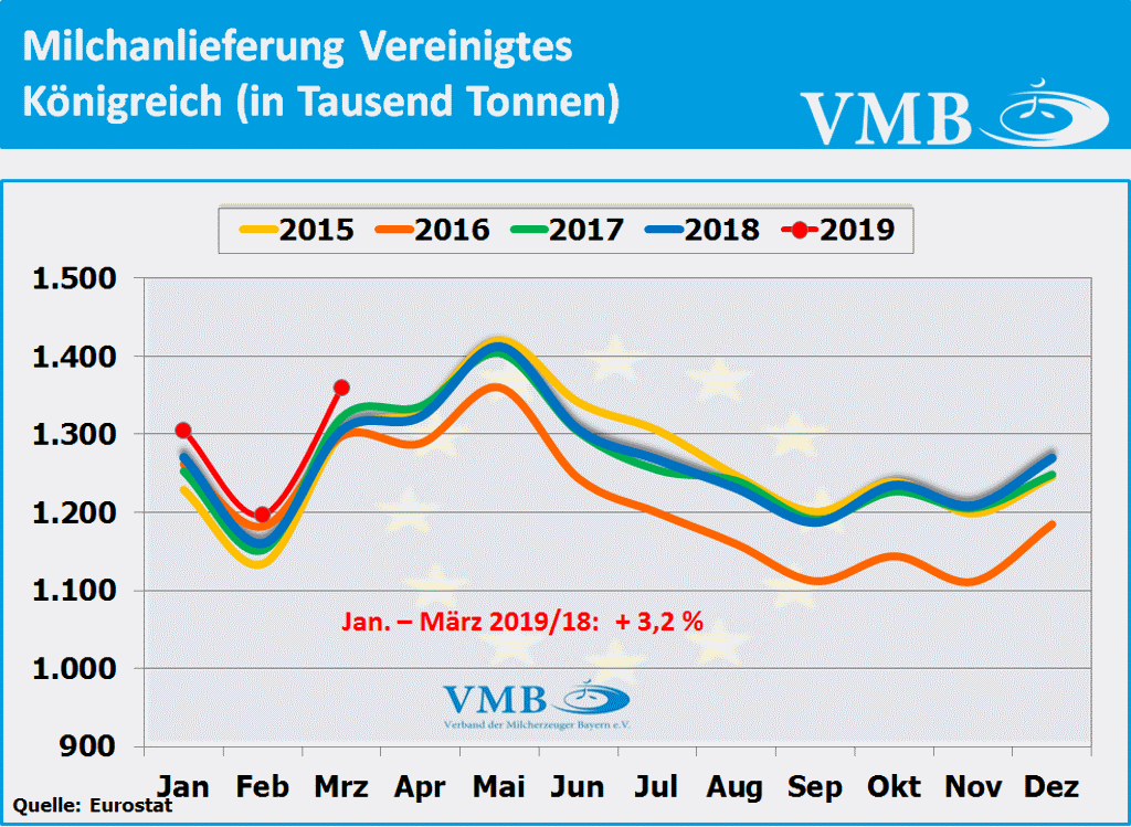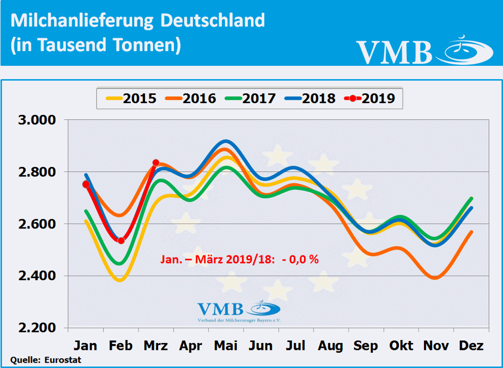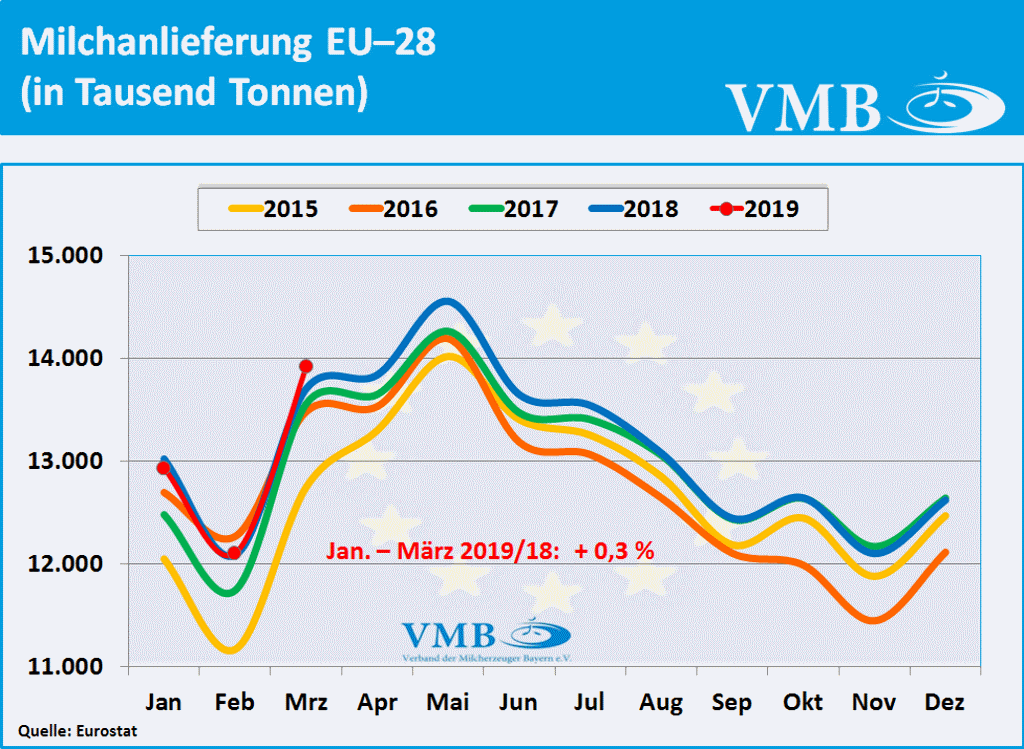 Nach Berechnungen des statistischen Amtes der Europäischen Union, kurz Eurostat genannt, liegt die für den Monat März 2019 veröffentlichte Milcherzeugungsmenge der 28-EU Staaten bei einer Milchmenge von 13,910 Milliarden Kilogramm. Dies bedeutet ein Plus von 1,5 Prozent gegenüber dem Vorjahresmonat. Nach Auswertung dieser Statistik beträgt für das erste Quartal 2019 die Gesamtmilchmenge 38,935 Milliarden Kilogramm. Somit hat die Milchmenge mit 0,3 Prozent eine leichte Erhöhung gegenüber dem Vorjahr eingenommen. Obwohl der Milcherzeugungstrend Anfang des Jahres 2019 sich unter den Vorjahreszahlen entwickelte, hat nun, infolge der gestiegenen Milchanlieferungen im Monat März 2019, die Anlieferungsbilanz eine Kehrtwende erlangt. Tendenziell kann aber davon ausgegangen werden, dass im zweiten Quartal 2019 das Milchaufkommen in Europa sich eher an der Vorjahreslinie orientieren wird.