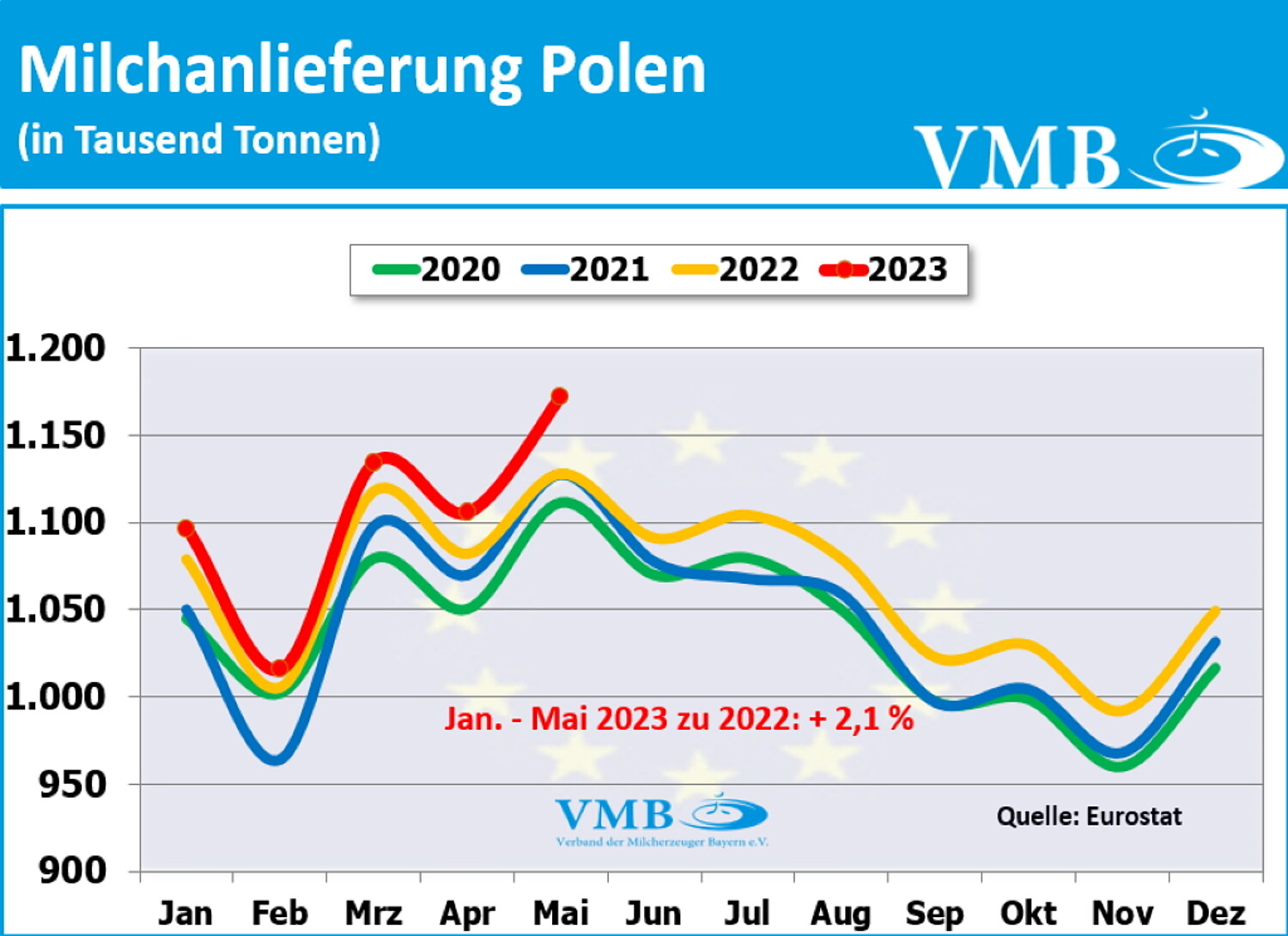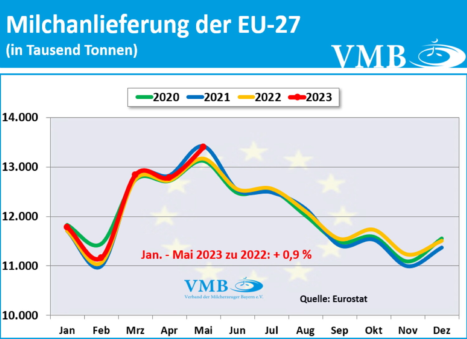 Das Niveau der europäischen Milcherzeugung steigert sich seit Jahresbeginn unerlässlich zum Vorjahr. In Zehntelprozentsätzen erhöhen sich die kumulierten Monatswerte, so dass mittlerweile, nach fünf Monaten, fast ein Plus von einem Prozent erreicht wurde. Das zum Teil noch gute Preisniveau hat das Erzeugungspotential etwas angeregt bzw. im Monatsvergleich in manchen EU-Staaten fast „beflügelt“. Im Mai 2023 erzeugten die europäischen Milcherzeuger 1,7 Prozent mehr als noch vor einem Jahr. 13,401 Milliarden Kilogramm wurden in diesem Monat abgegeben. Dies sind 227 Millionen Kilogramm mehr. In Summe ergibt sich in den ersten fünf Kalendermonaten eine Menge von 61,927 Milliarden Kilogramm Milch. Dies entspricht einem Plus von 0,9 Prozent bzw. von 534 Millionen Kilogramm mehr Milch.