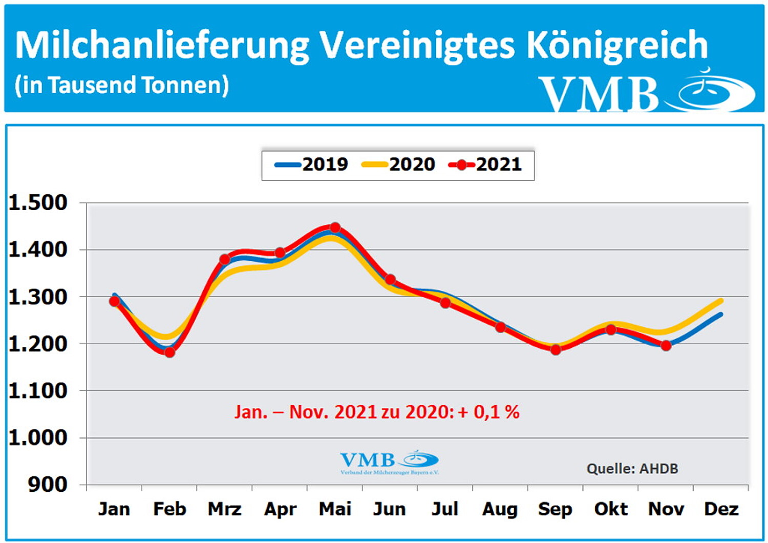 Nach Angaben der AHDB liegt die vorläufige Gesamtanlieferung des Vereinigten Königreichs in den ersten 11 Monaten für 2021 um 0,1 Prozent höher als im vergleichbaren Vorjahreszeitraum. Somit könnte die Jahresmilchmenge mit 15 Milliarden Kilogramm knapp überschritten werden. Im November 2021 lag die Monatsmilchmenge um mehr als zwei Prozent zum vergleichbaren Vorjahresmonat zurück.